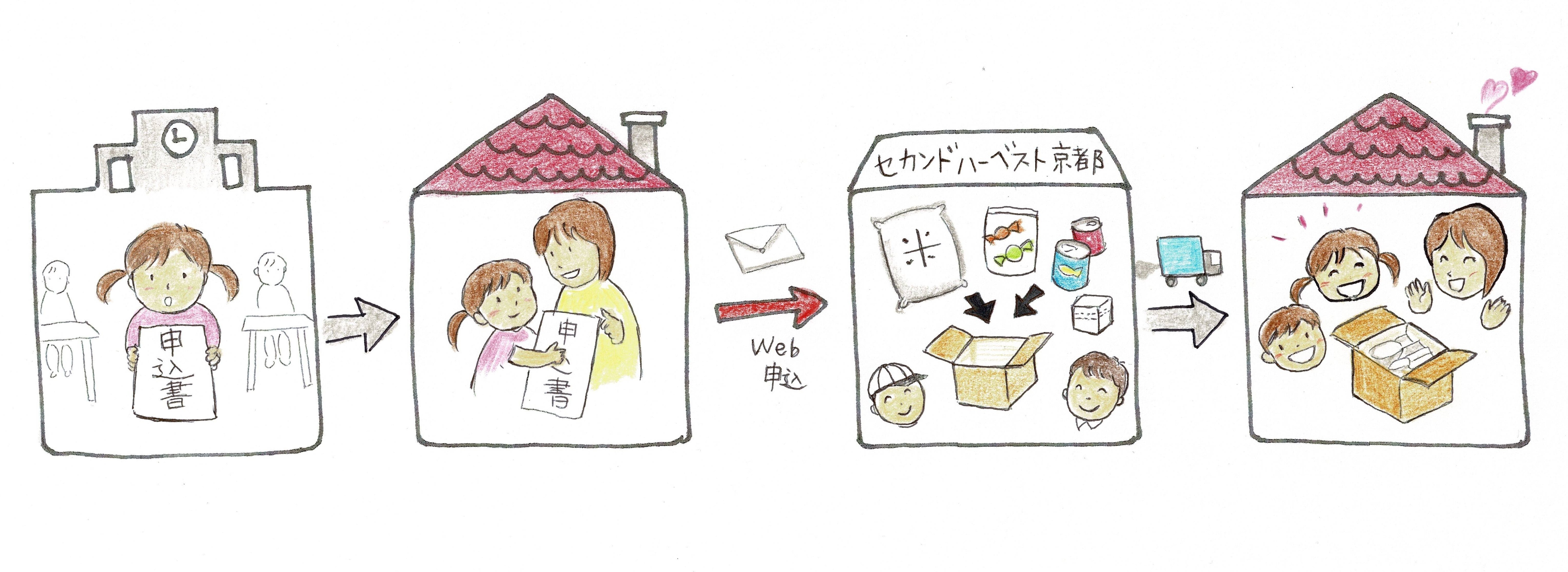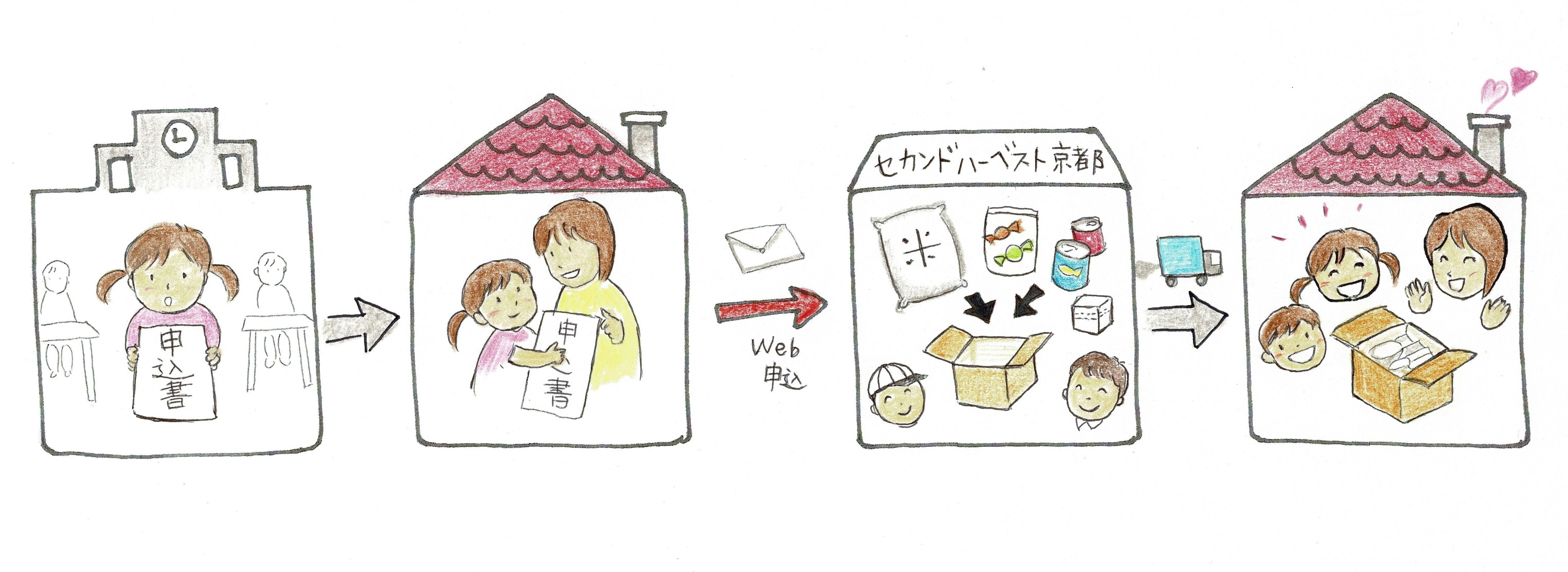 小学校を通じて保護者に案内→ 希望世帯はセカンドハーベスト京都に直接申し込み→ 宅配便で各家庭に直接お届け