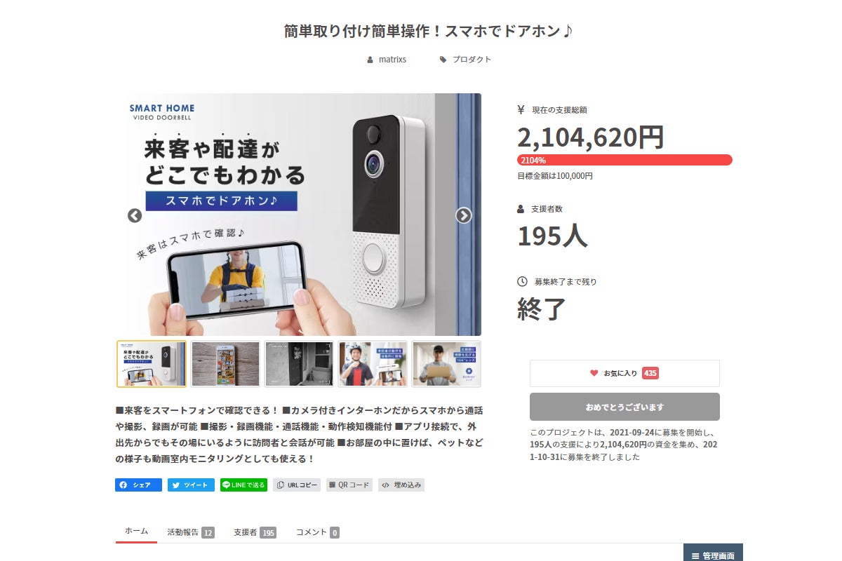 サポーター195名様 応援購入総額 2,104,620円 お気に入り435名様