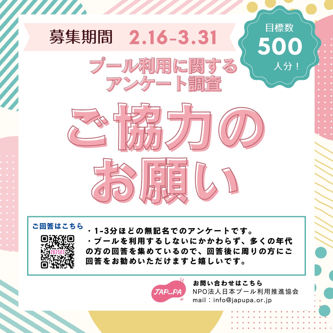 2月16日から開始した「プール利用に関する意識調査」、目標の500件を達成し、もうすぐ600件に到達です!https://japupa.or.jp/?p=806ご回答いただいた方、シェアしてくださった方、ありがとうございます。3月31日の締切まで、まだまだ回答募集中です。私たちが一番聞きたい「プールに行かない人」の声を、幅広い年代の方から聞けたらと思います。〔回答方法〕下記のフォームにアクセスしての回答https://questant.jp/q/K7H7VNRZ所要時間:1-3分対象:問いませんご自身のご回答後に、SNSやお知り合いの方へのシェアなどもお願いできたら嬉しいです!よろしくお願い致します。