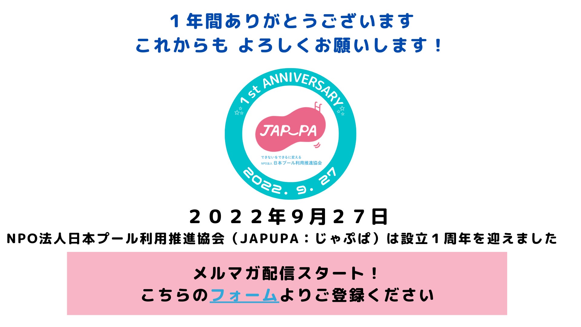 そして本日9月27日、NPO法人日本プール利用推進協会(JAPUPA:じゃぷぱ)は設立1周年を迎えました。