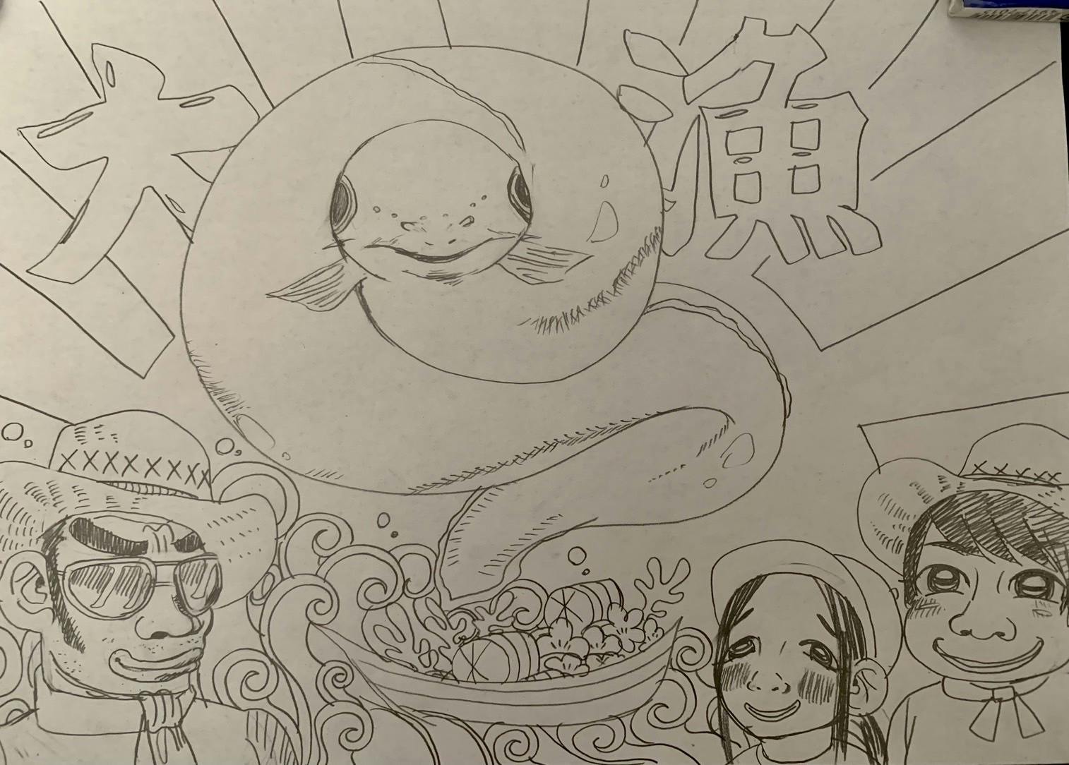 リターンに設定してる大漁籏は支援して下さった方のアニメっぽい似顔絵と、村長や愛ちゃん、りょっさんと一緒に大漁籏となり小屋が完成さたら飾る籏です。