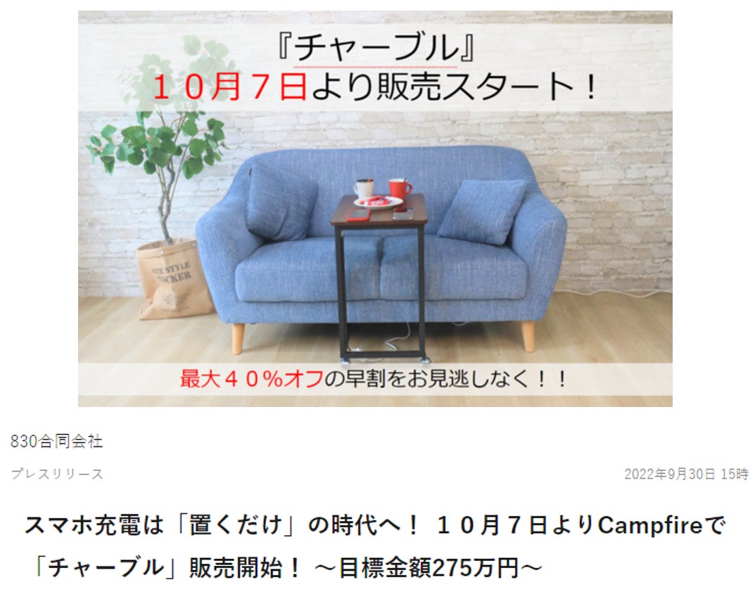 昨日、10/31 23:59をもちましてクラウドファンディングを終了致しました。ご支援くださった皆さま、応援して下さった皆さま、ありがとうございました。今回のクラウドファンディングは残念ながら目標金額を達成することができませんでした。All or Nothing形式で実施しておりましたため、ご支援につきましては全額払い戻しとなり、リターンの発送も行わない予定となっております。Campfireより別途連絡があるかと思いますので、メール等ご確認頂けますと幸いです。不明瞭な点がございましたら、こちら宛にご連絡頂ければ代わって Campfireに確認させて頂きますので、ご気軽にご相談ください。クラウドファンディング未達となってしまったため、現時点でチャーブル発注の目処は立っておりません。しかしながら、本クラウドファンディングを通して様々な方からご連絡を頂くことが出来まして、引き続き充電に悩まない世界を実現するべく事業検討を進めていこうと考えている次第でございます。またどこかで本サービスを目にするようなことがございましたら、今回のクラウドファンディングを思い出して頂けますとうれしい限りでございます。この度は本当にありがとうございました。
