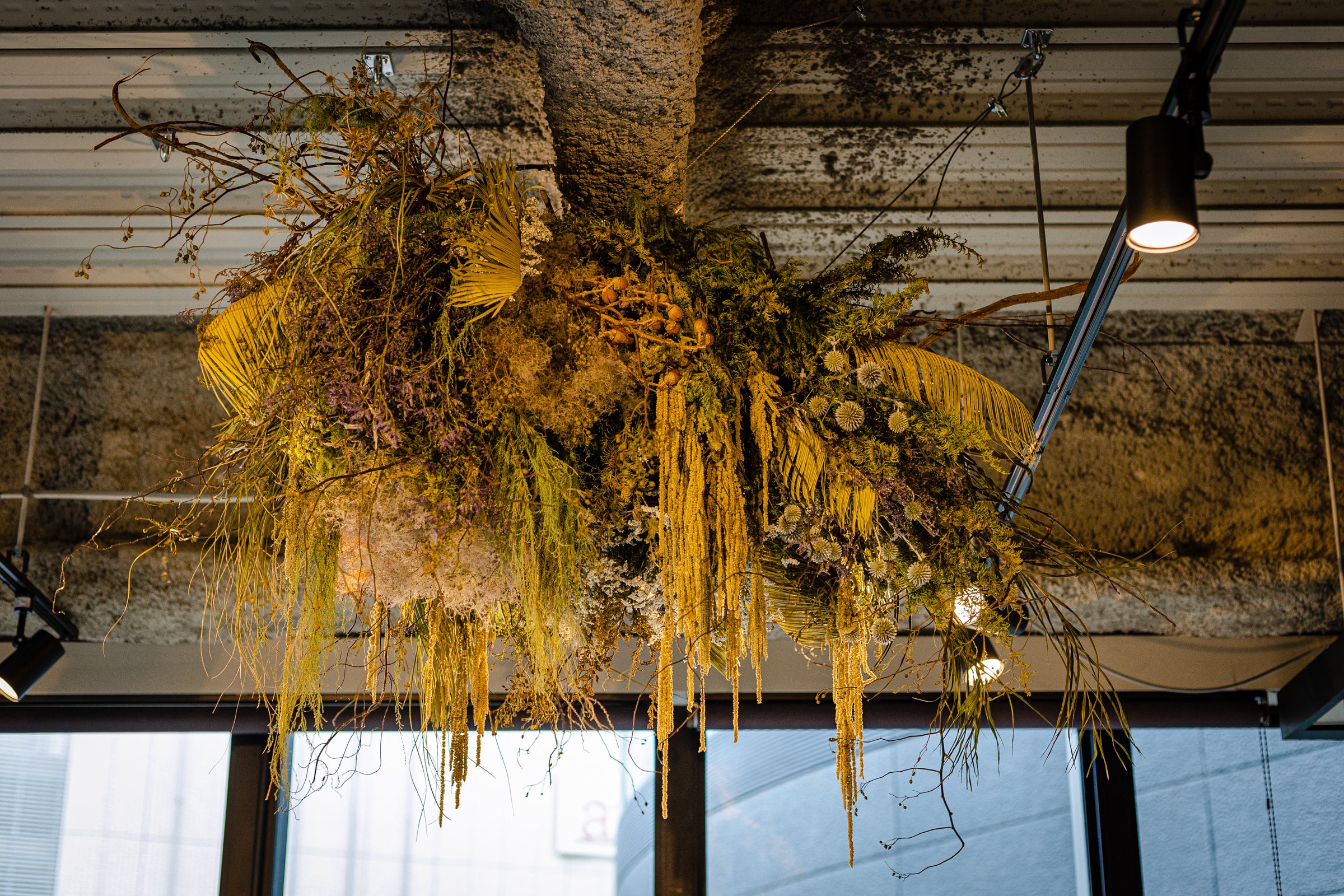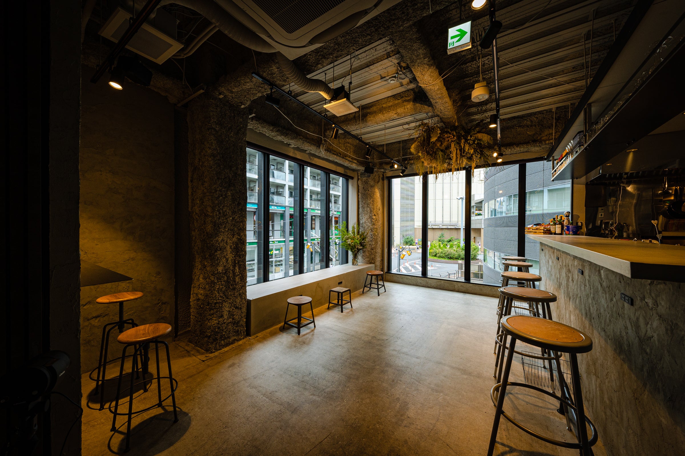 店内は、外国の倉庫をリノベーションした雰囲気を演出するデザインとなっていて、コンクリート打ちっぱなしの状態や、解体時の壁欠け、天井などをむき出しの状態に。
