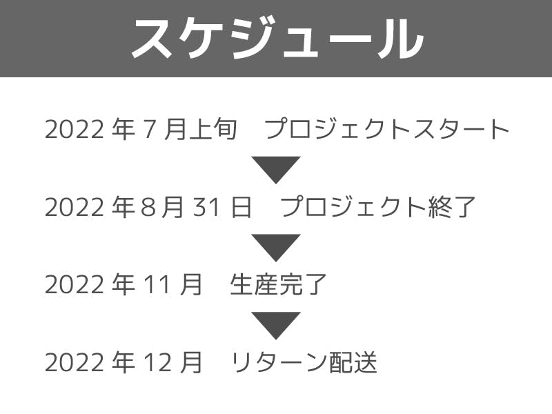 リターンは2022年12月にお届け予定です。万が一製造及び物流の遅れが生じた場合は、判明次第ご報告いたします。