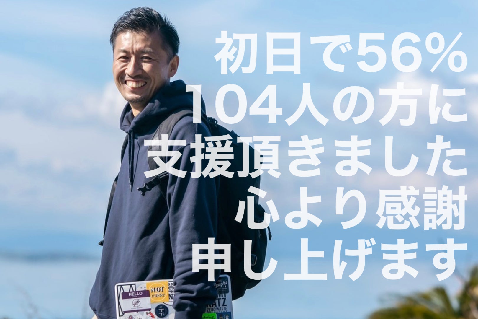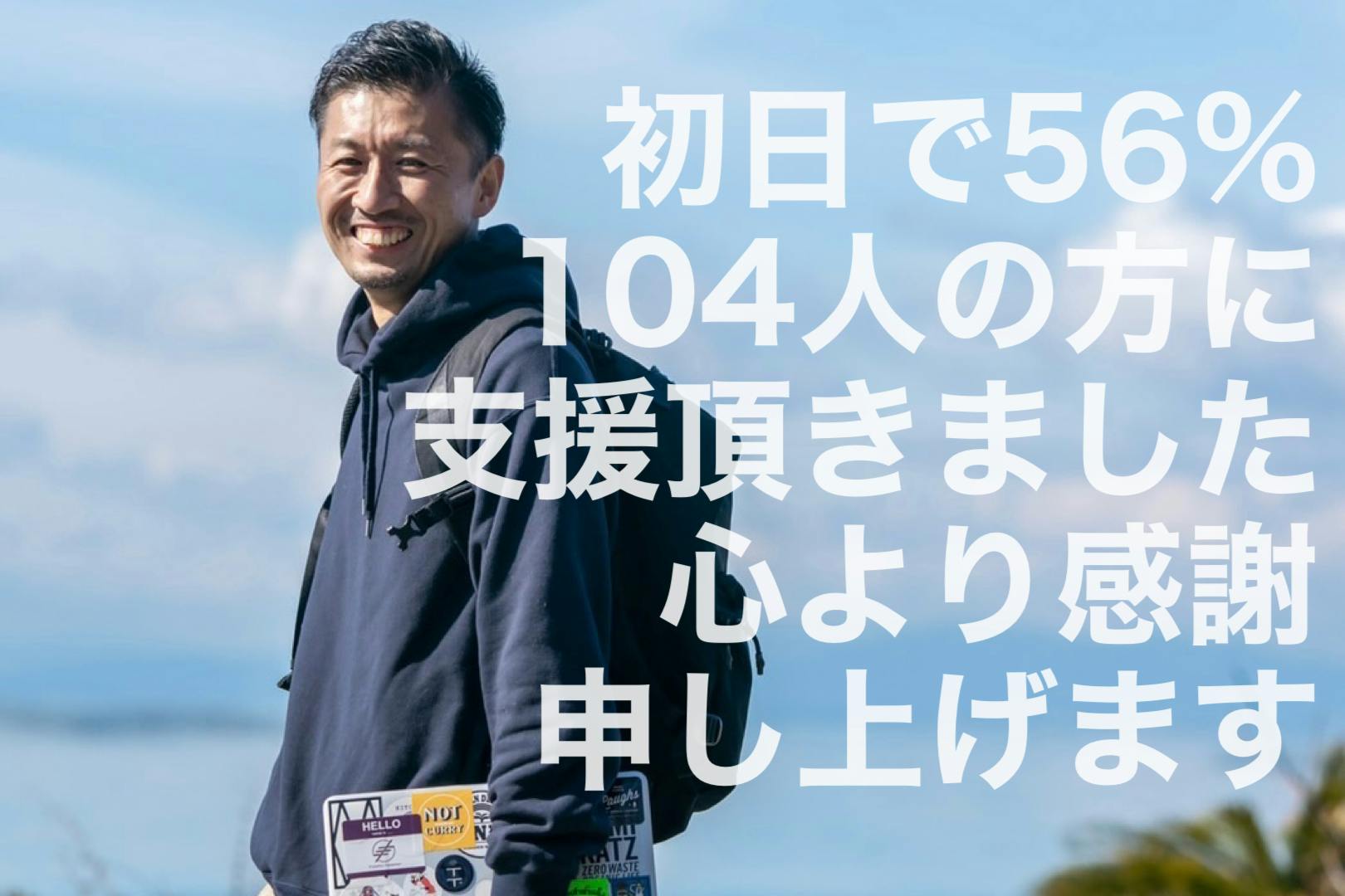 皆さまのお陰様でクラファンスタート初日で達成率56%・104名の皆様にご支援頂きました。本当にありがとうございます。