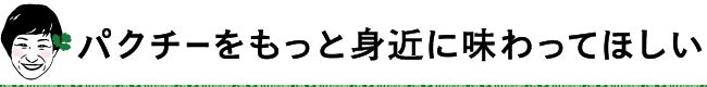 最近はパクチーの認知が広がり、お店やご家庭でも食べていただく機会が増えてきました。しかし、まだまだパクチーは苦手という方が多かったり、特定の料理で使われることが多く、一般的になっていないという現状があります。