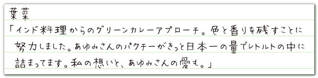 「パクチーカレー」は、人気南インド料理店「葉菜」さんとレシピを作り上げ、レトルト化をするにあたり老舗インドカレー店「デリー」さんに協力いただきました。本場のコックさんが1つ1つ手作りのカレーをレトルト化する「アトリエデリー」で作ってもらいました。手作りで丁寧に商品にしてもらうため、大量生産は出来ず、1ヶ月200個限定となりますが、本格的な商品となっております。