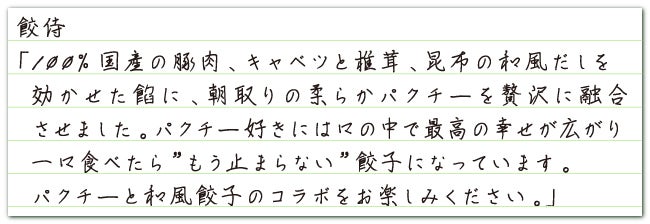 「パクチー餃子」は、国産の食材にこだわって、タレをつけずに食べられる餃子を販売している「餃侍」さんにご協力いただきました。パクチーの良さをしっかりと味わってもらえないかと考えていたところ、食材の良さを活かして餃子を作っている「餃侍」さんに出会い、商品化に協力いただきました。試行錯誤を何度も繰り返し、素材本来の良さを引き出した餃子が完成しました。