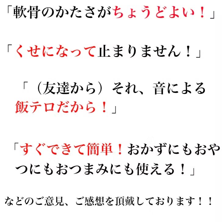 ・原材料名:鶏軟骨(タイ)、衣(でん粉、パン粉、小麦粉、食塩、ぶどう糖、香辛料、粉末状植物性たん白、植物油 脂)、たれ(糖類(ぶどう糖果糖液糖、砂糖(三温糖、加工黒糖))、しょうゆ、米醗酵調味料、醸造酢、食 塩、香辛料、しょうゆ加工品、酵母エキス、味噌加工品)、揚げ油(大豆油)/加工デンプン、調味料(アミ ノ酸)、着色料(カラメル、パプリカ色素)、膨脹剤、増粘多糖類、セルロース、甘味料(スクラロース)、 (一部に小麦・大豆・鶏肉を含む)