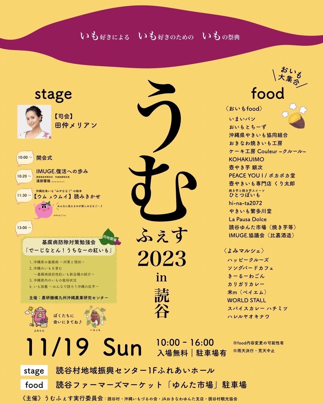 2023/11/08 19:31みなさま お元気でお過ごしでしょうか・・。早いもので、あれからあっという間に一年余の時が流れました。この一年あまり、みやななごprojectとしては、皆様にお伝えしておりましたように地に足をつけて活動をすべく、ひとつひとつ..一歩一歩読み聞かせや農業体験などを行って参りました。また、私たちだけでなく、それぞれの地域で読み聞かせを行ったよ!というお話も届けられ心から嬉しく思っております。ありがとうございます。そして、今年も来る11月19日(日)に~いも好きによる いも好きのための いもの祭典~『うむふぇす2023 in 読谷』を開催する運びとなりました。今年の内容はより深く沖縄の紅芋について学べる場も設定されております。普段はなかなか学べない内容が盛りだくさんですのでぜひ足を運ばれていただけると嬉しいです。もちろん【ウムヌ ウムイ】の読み聞かせもあります。今年も、この『うむふぇす2023 in 読谷』を通して様々な視点から、沖縄のお芋についてお届けできることを嬉しく思っています。foodブースでは、いろんなお芋のお味を堪能できますよ!ぜひ会場でお会いできること楽しみにしています!どうぞよろしくお願い致します。〇日時 2023年11月19日(日) 10:00~16:00 〇場所 stage 読谷村地域振興センター1階 ふれあいホール food 読谷ファーマーズマーケット「ゆんた市場」駐車場 〇入場無料/駐車場有 もっと見る農業体験 in 読谷