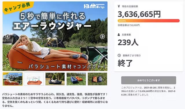 2022/08/30 11:53こんにちは!先日プロジェクトが無事に終了しました。ご支援いただいた方には誠に感謝申し上げます。これからご支援内容を確認し、製造と配送の方に進めさせて頂きますので、何卒お待ちいただけますと幸いです。エアーラウンジャー&エアーソファで気持ちい休日を過ごされることを楽しみにしていて下さい^_^引き続き宜しくお願いいたします。 もっと見る目標金額早くも達成しました。誠に感謝申し上げます。