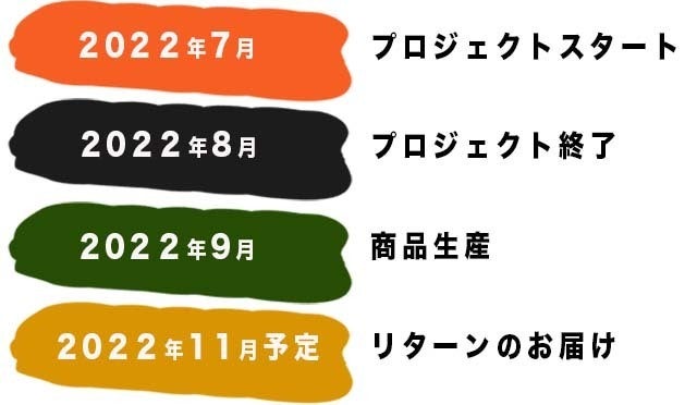 ※本文中に記載させていただいたスケジュールは、あくまでプロジェクト公開時点の予定です。ご支援購入の性質上、配送遅延のおそれがございます。