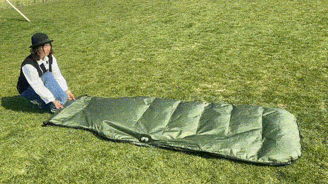 専用の扇板でパタパタして膨らます方法は、全体をほぐし大きく広げてください。片方の足でベルトの下部を押さえパタパタし、ある程度空気が入ったらベルトを合わせ、空気がパンパンになるまで奥までくるくる巻き付け、バックルを閉めてください。