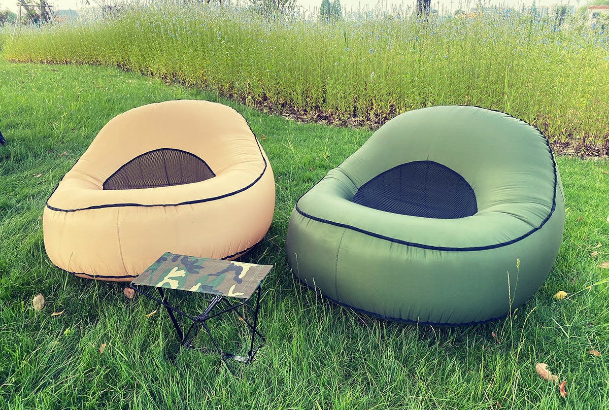 ボタン1つで自動で1分で膨らますことができる、高品質パラシュート素材で超小型エアーポンプ内蔵、新エアーラウンジャー・エアーソファの新登場です。