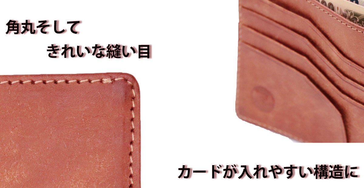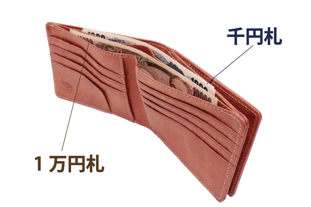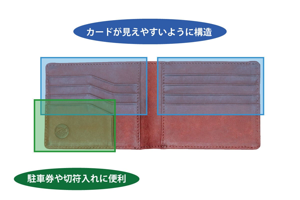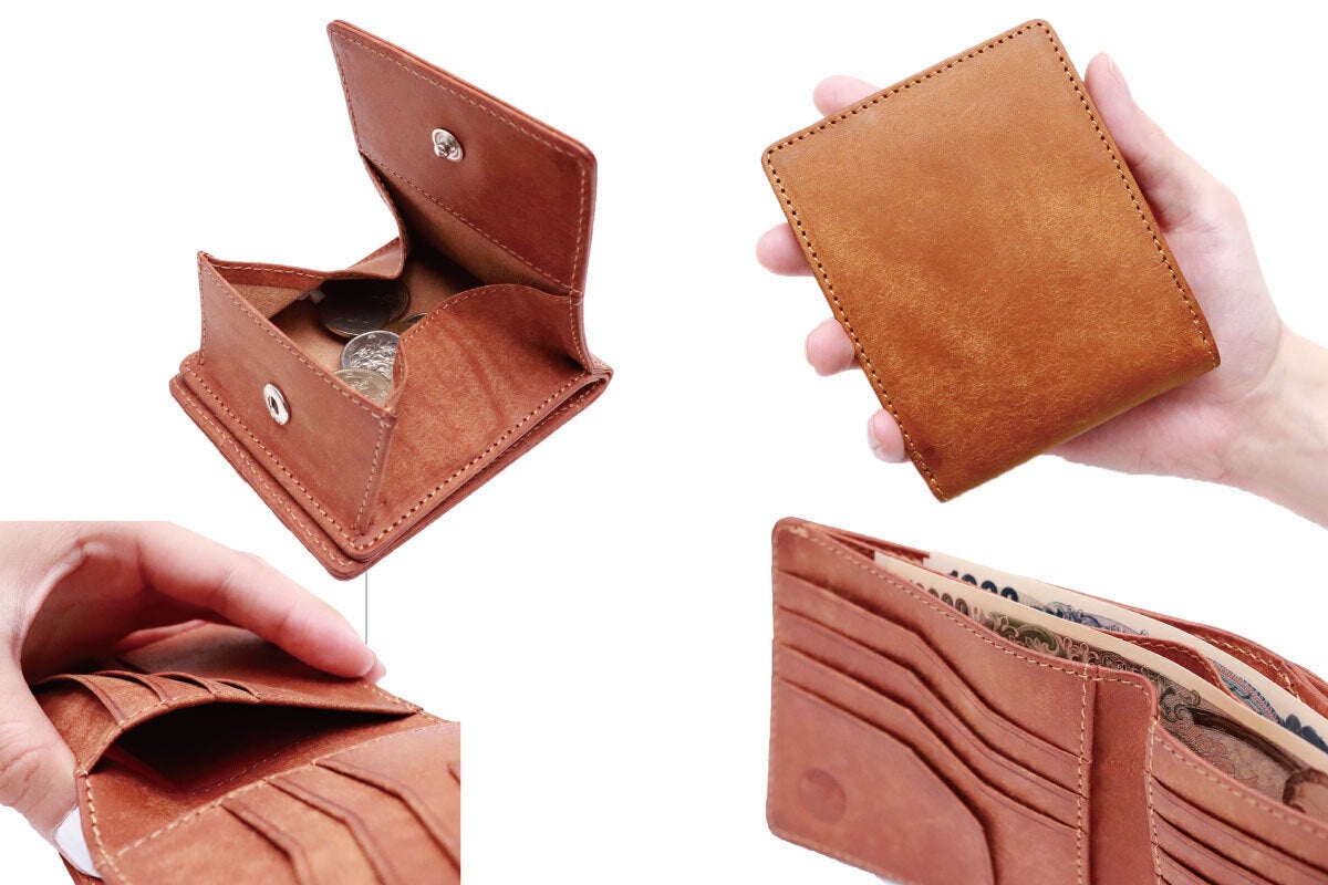 【Mucca】は牛本革を使った二つ折り財布で、お札・小銭・カード等の収納に困ることがない財布です。