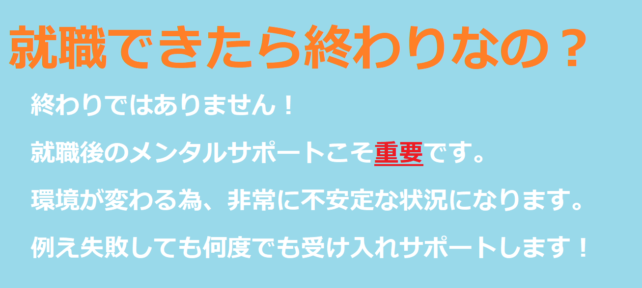 そんな状況が続く中で心の調子を崩してしまった方々も多く、早く就職をして働かなければと思うほど気が焦り更に心の調子を崩してしまいます。