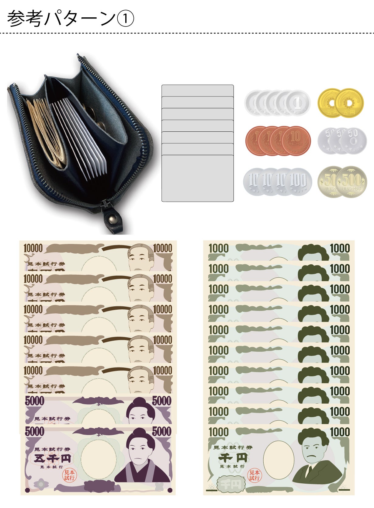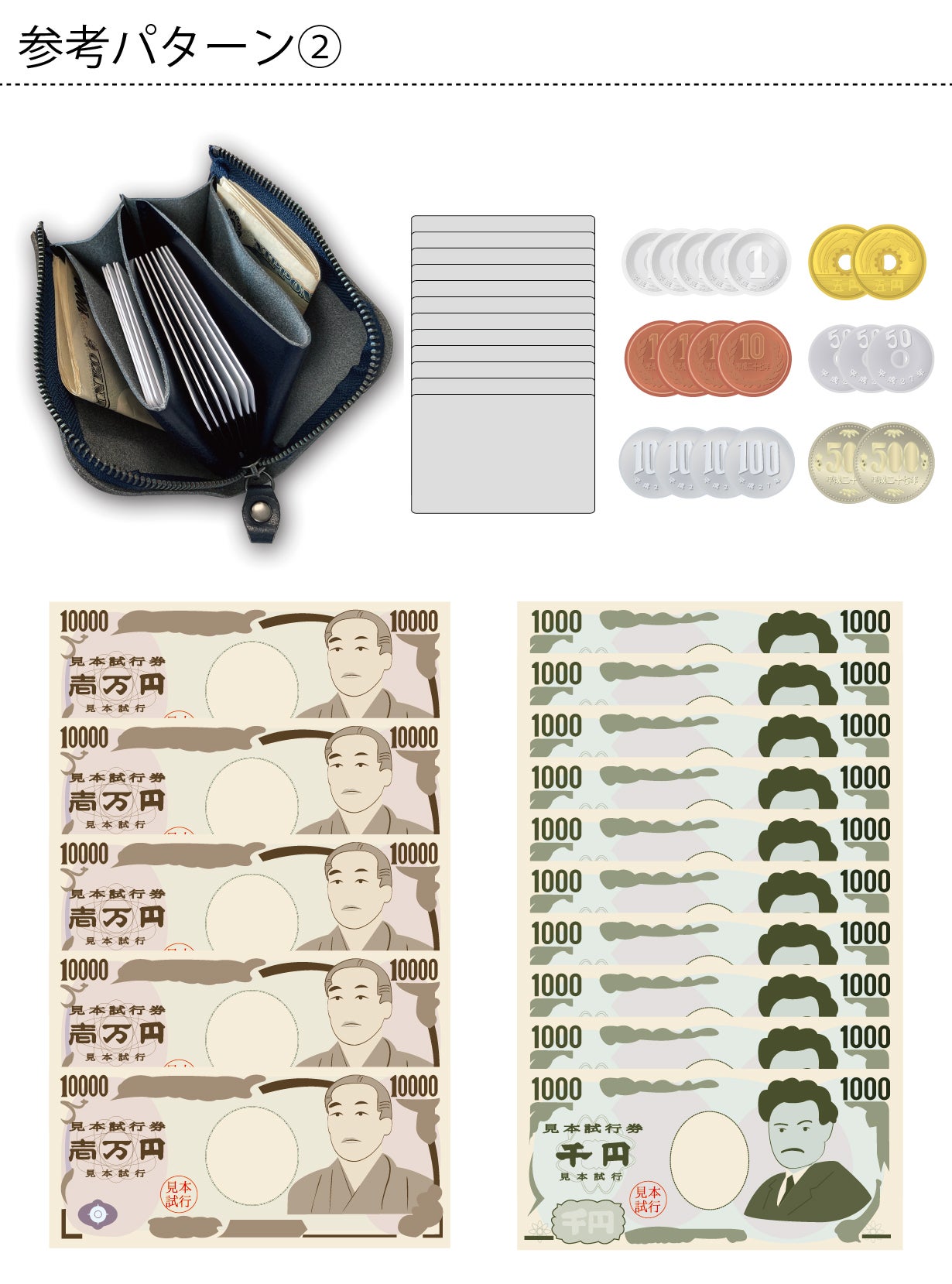 お札15枚、コイン20枚、カード12枚の収納パターン。