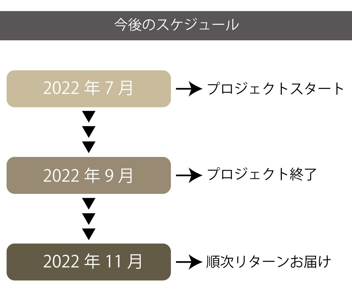 ※本文中に記載させていただいたスケジュールは、あくまでプロジェクト公開時点の予定です。 クラウドファンディングの性質上、配送遅延のおそれがございます。 原則として、配送遅延に伴う応援購入のキャンセルはできませんが、リターン配送予定月から3ヶ月を超えた場合には、希望者に限りキャンセルにて対応させていただきます。