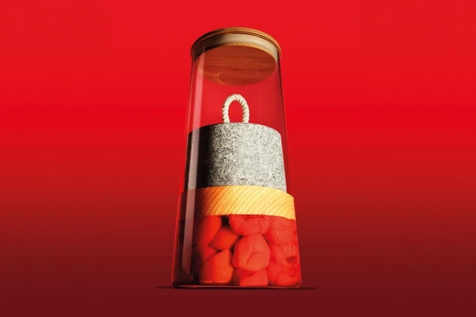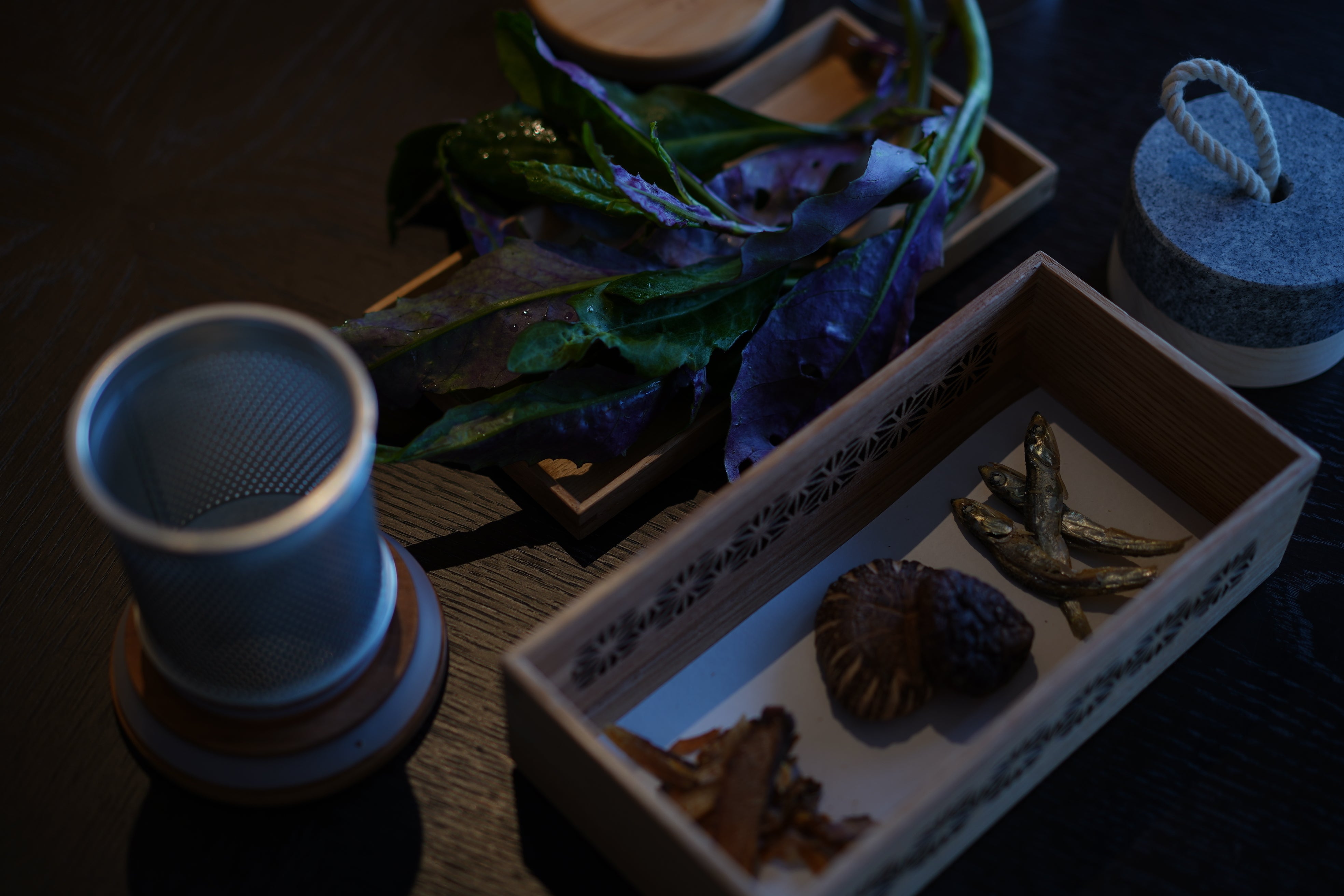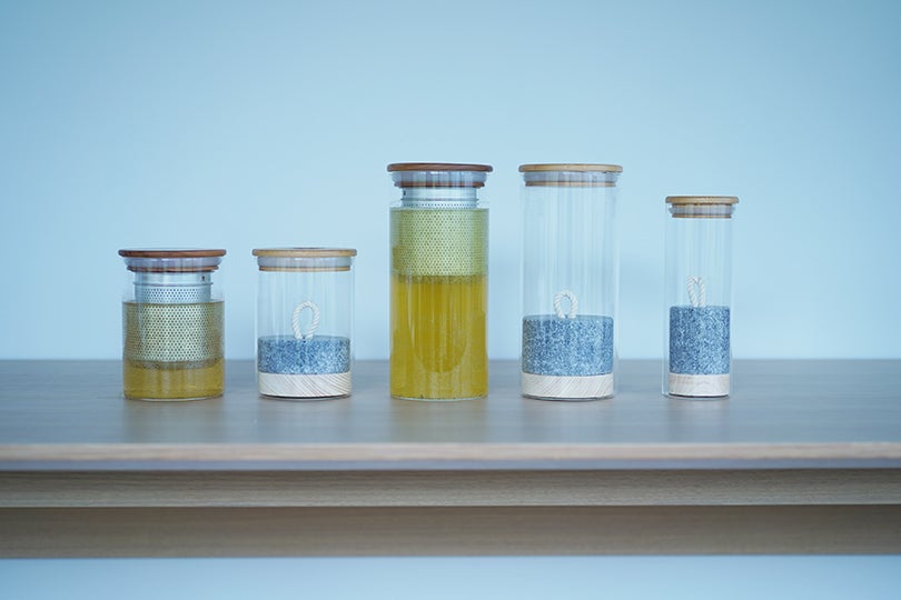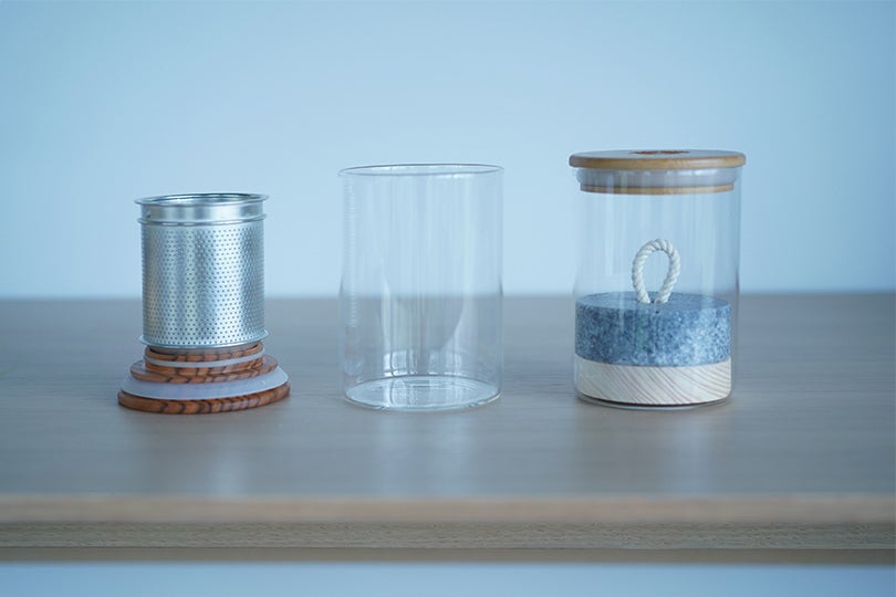今回新たに考案したプロダクト、冷たい出汁やお茶を抽出する「Picklestone T-Unit」の使い方も、もちろん簡単です。T-Unitのカップに、鰹節、昆布、唐辛子、塩を入れ蓋をしたら、水をいれたガラスポットに浸しておく、たったこれだけ。冷蔵庫のサイドポケットに一晩つけておくだけで、雑味のない甘みと深い香りの出汁を作ることができるのです。