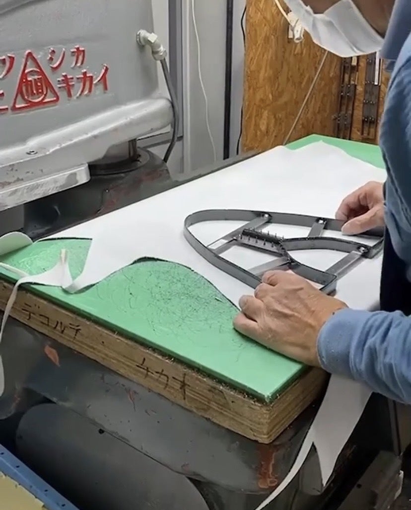 この平面の革を裁断し、ミシンで縫い合わせて立体的にし、底付け~仕上げとなり、皆さまへお届けする「JAZZフラットシューズ」となります。