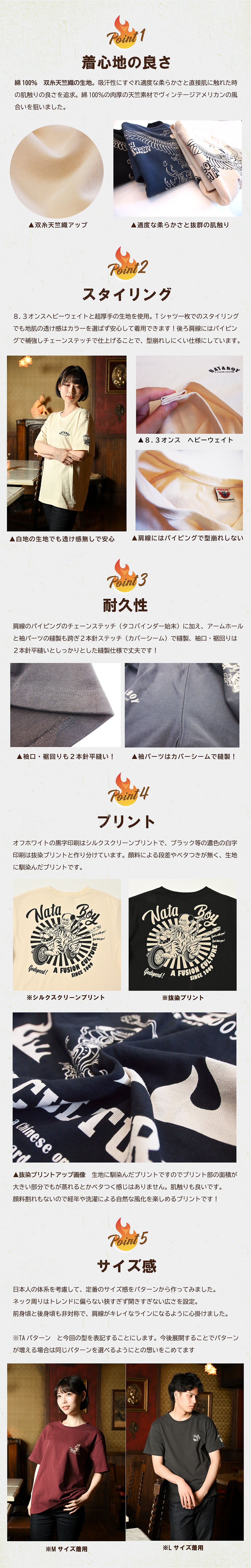 基本的に黒字のプリントはシルクスクリーンプリントでプリントしております。対して白字のプリントは抜染プリントでプリントしております。顔料は生地に馴染む感じに仕上がるように狙って一体感のある手触り、プリント部分でベタっとしたり着用時に蒸れるというのが無いようにこのプリントにしています。また、洗濯などでプリント部分の色落ちや顔料の割れなども避けることも狙っておりますので、洗濯を重ねる場合にかすれていくなど、ヴィンテージ感の味わいを楽しんで頂ければと思います。