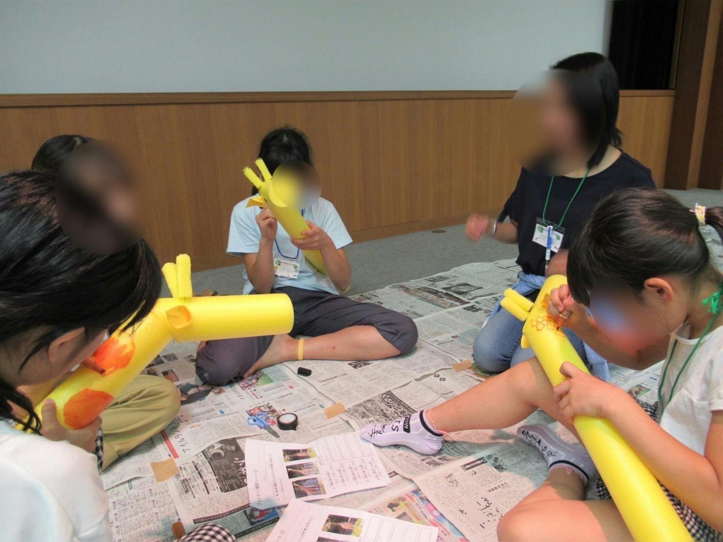 上の写真は、ガイドで使用するパネルや模型などのグッズを製作している様子と、実際にガイドを行っている様子です。ガイドで利用するグッズは、ガイドを聞くお客さんがわかりやすいように、こどもたちが頑張って作成します。実際に動物園で与えている餌や、模型やパネルなどを用いて、声だけでなく目からの情報も加えて、理解しやすいようにしています。