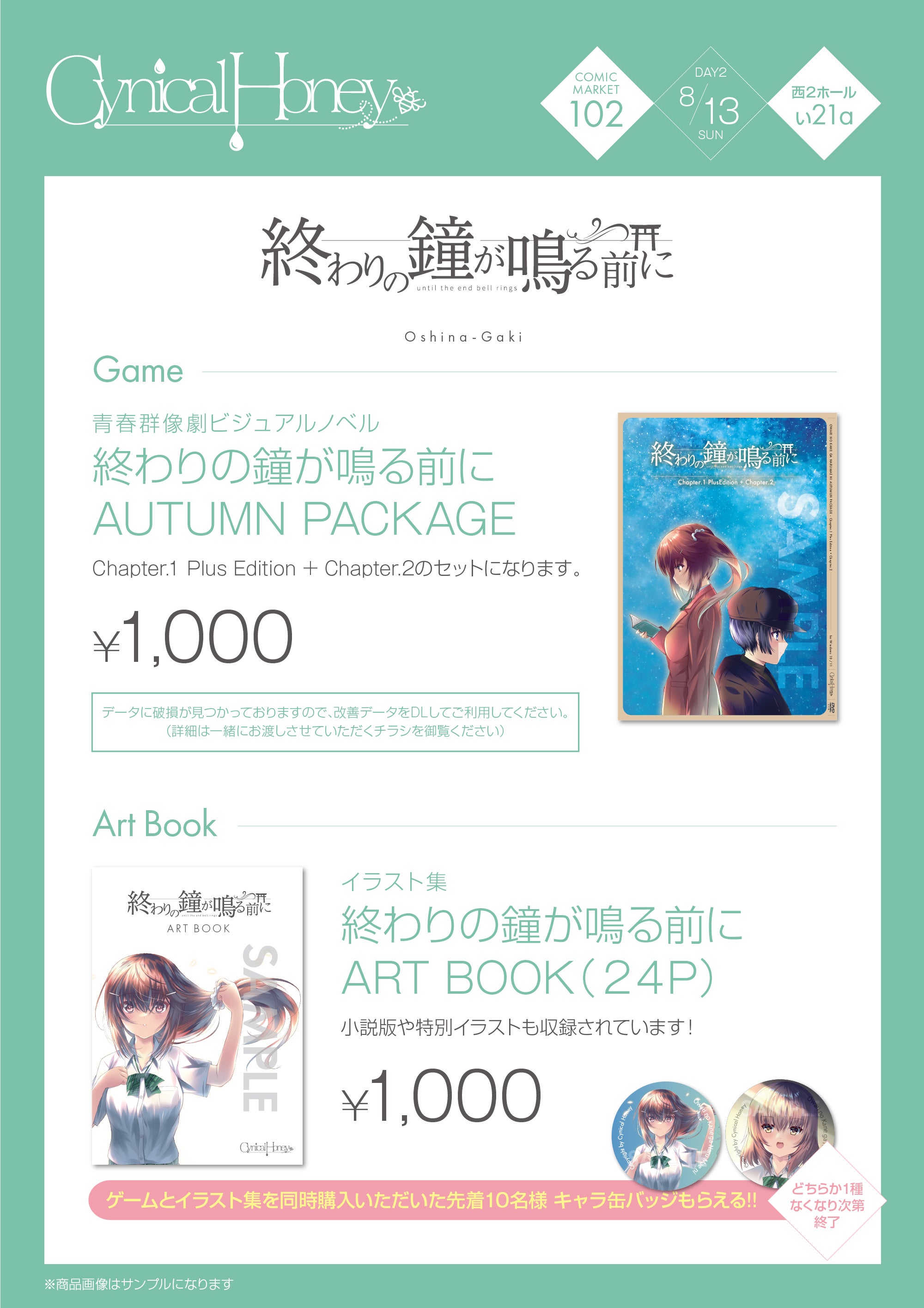 あとイラスト集になり、ゲームとセットで購入していただくと先着10名様に缶バッジをプレゼントします(イラスト・缶バッジはリターンのものと同じになります)