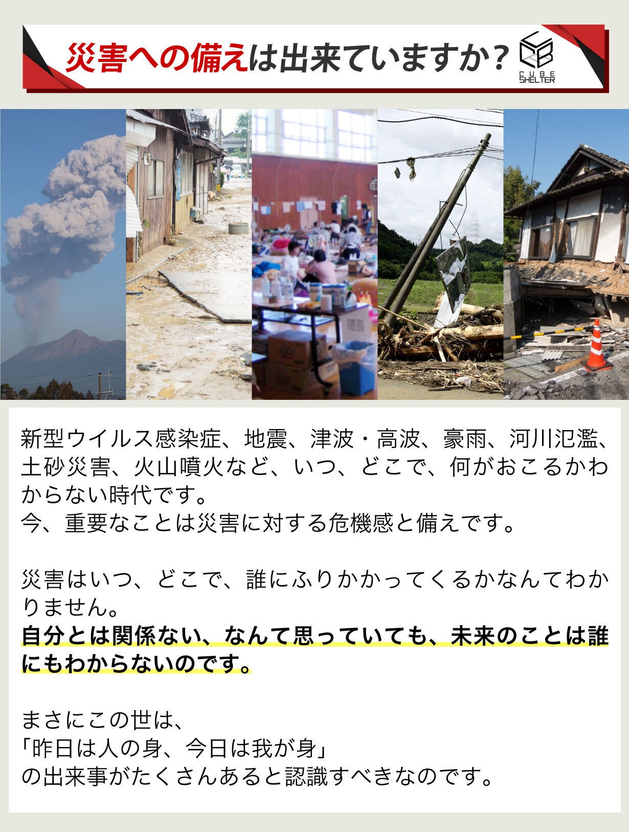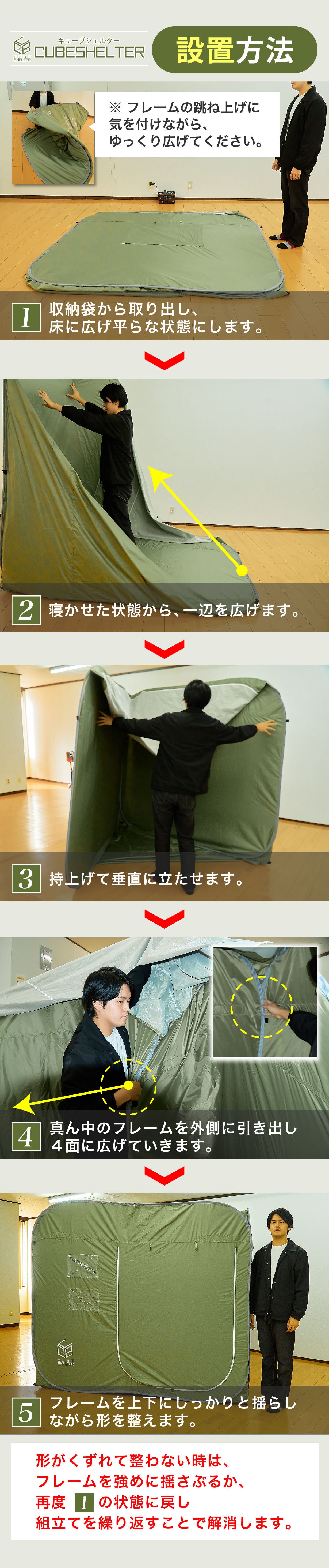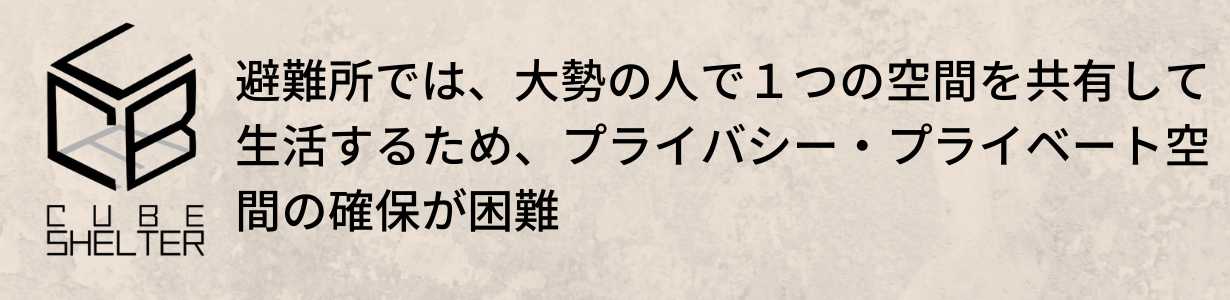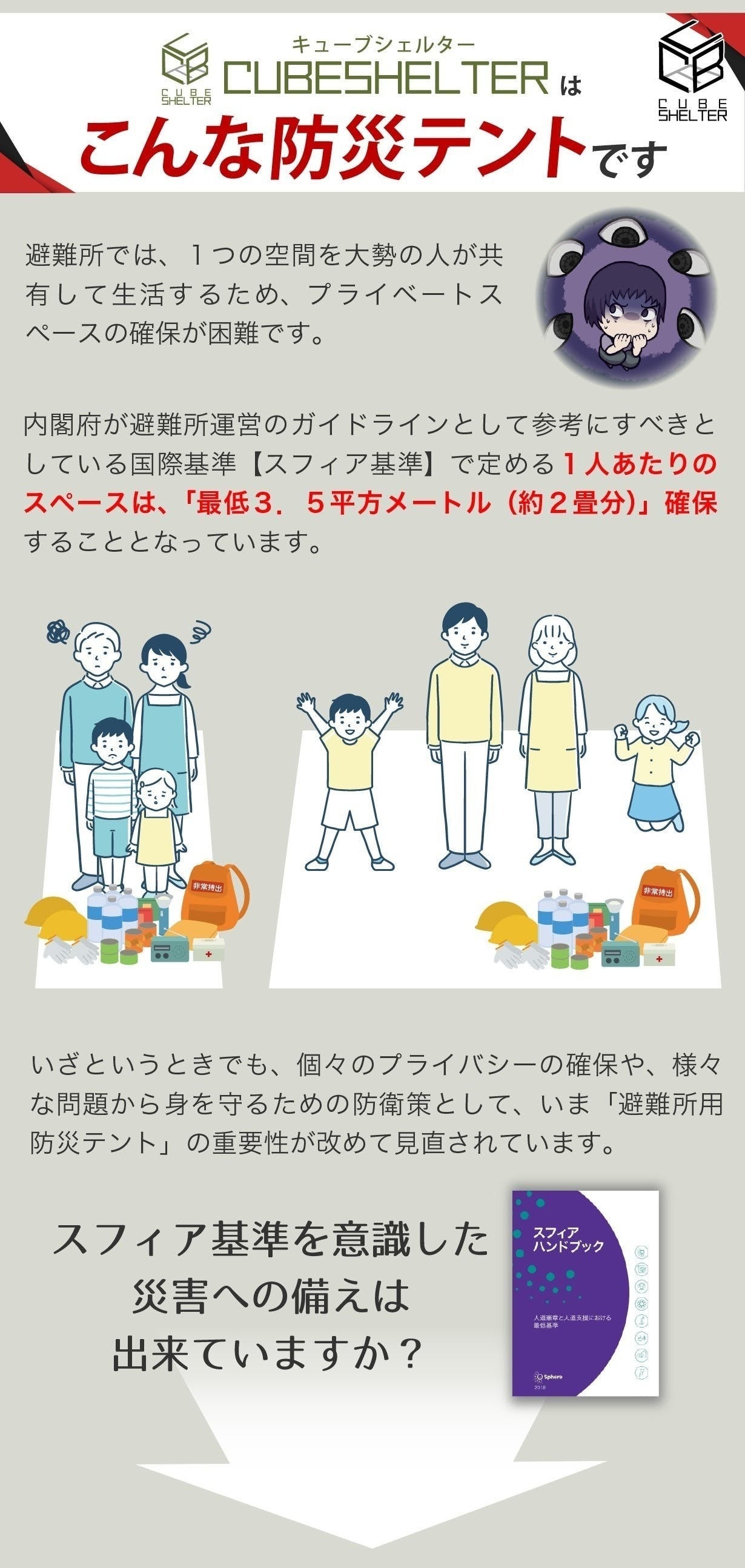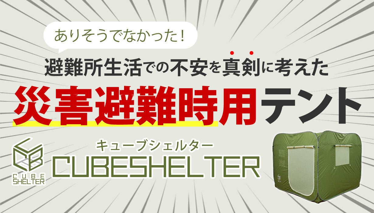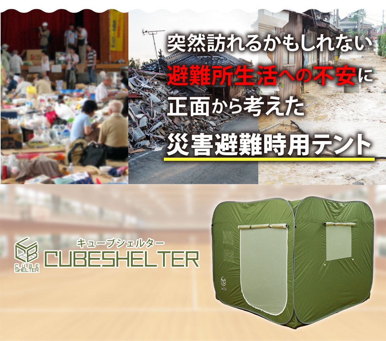 「キューブシェルター」は、必ずしも望まない避難所生活においての不自由や不安など様々なリスクを洗い出し、簡易テントで出来うる限りの対策を盛り込み考案した、当社独自のオリジナル商品となります。