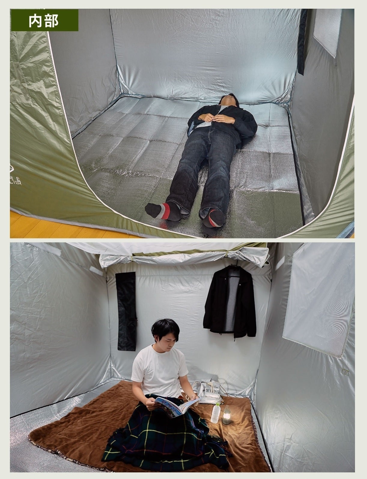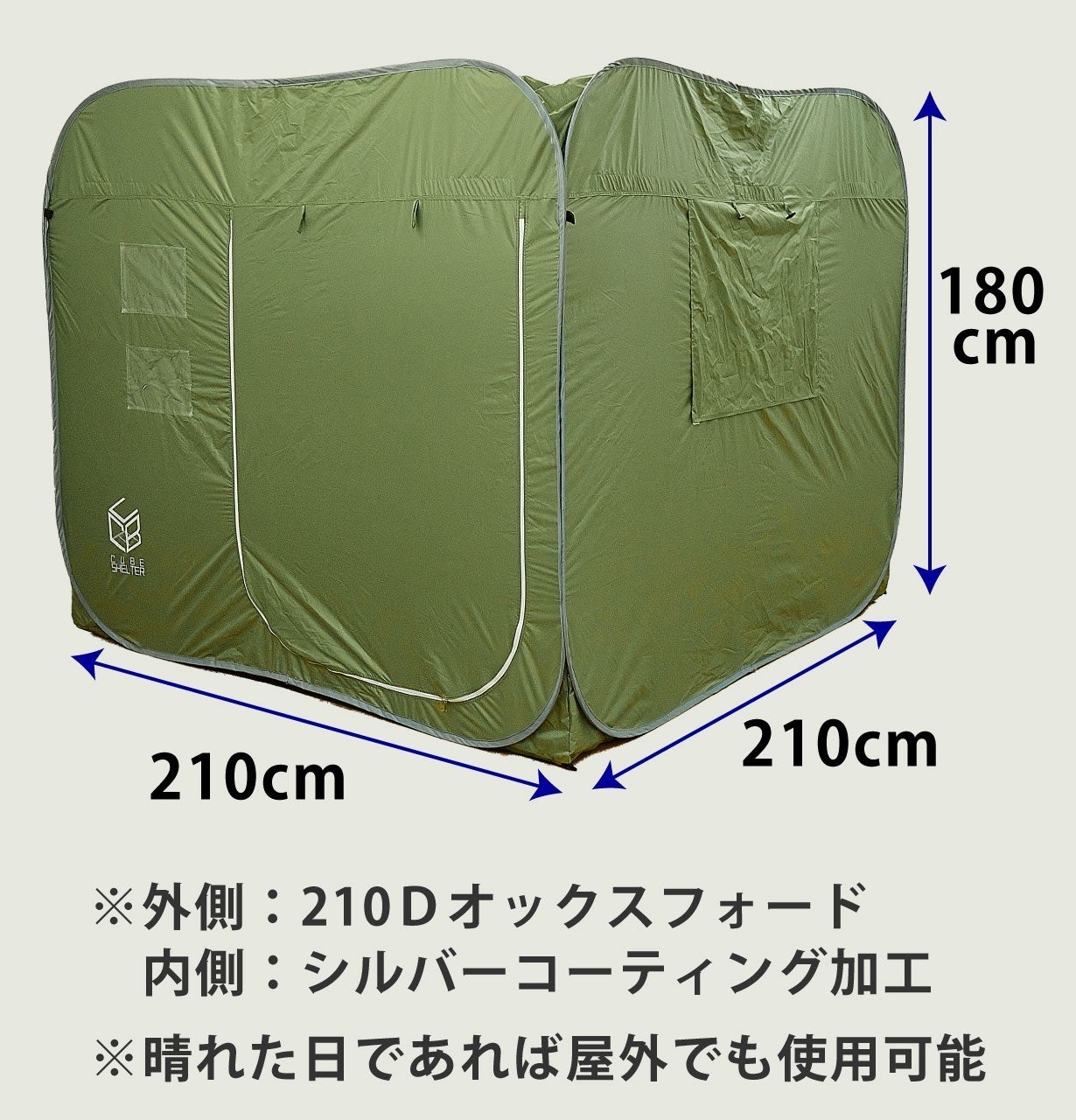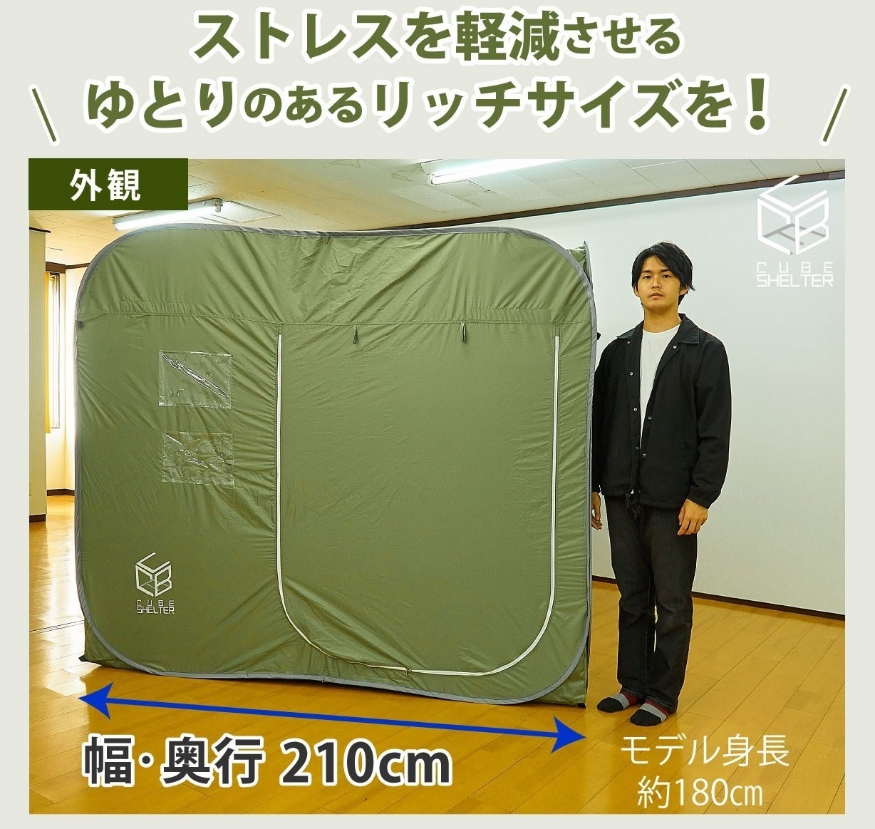 また、高さは180㎝とあえて日本人男性の平均身長以上に設計することにより、容易に上から覗けず、かつテント内での圧迫感の軽減効果も期待されます。