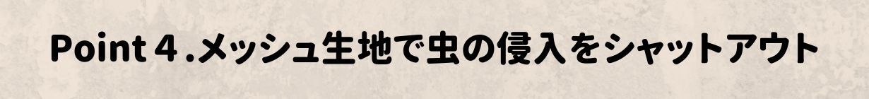 出入口、天井、横窓には、通気性の良いメッシュ生地を取り付けました。蒸し暑い夏場や夜間の虫対策も万全です。