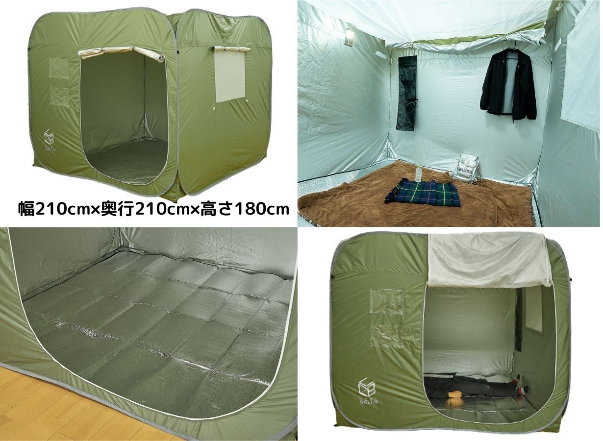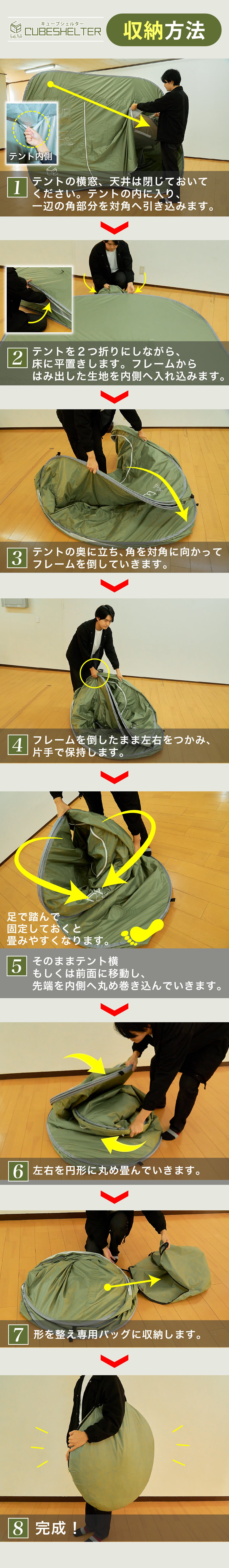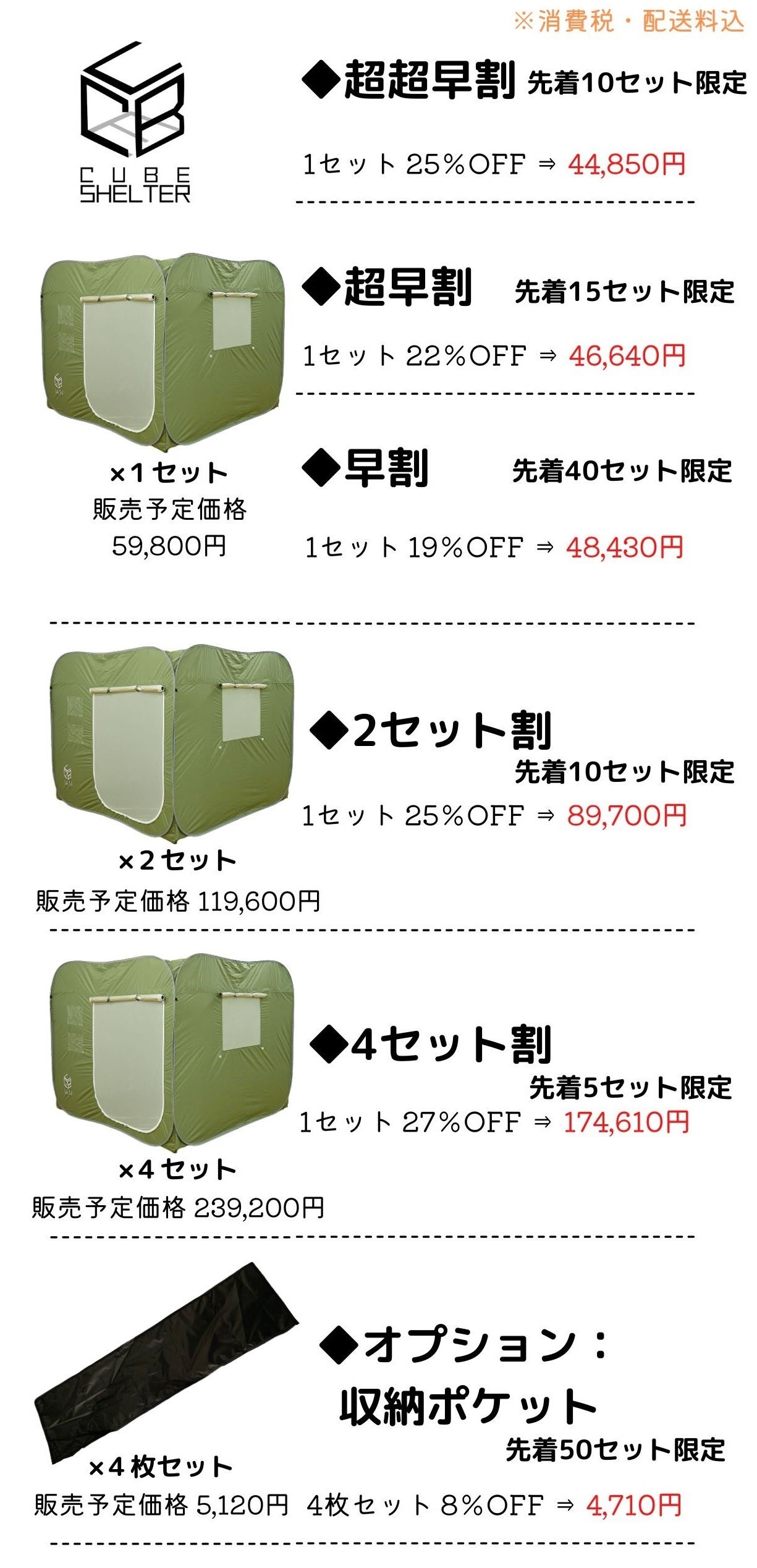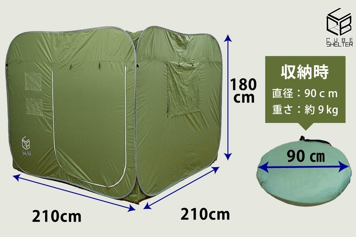 《セット内容》キューブシェルター本体×1、専用3modeカーテン×1、ダイヤル錠×1、小物収納ポケット×1、アルミマット×1、収納袋×1