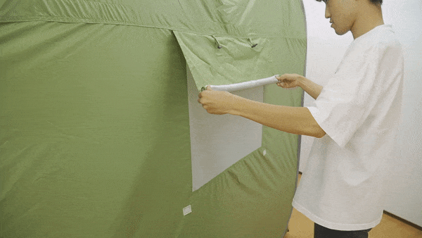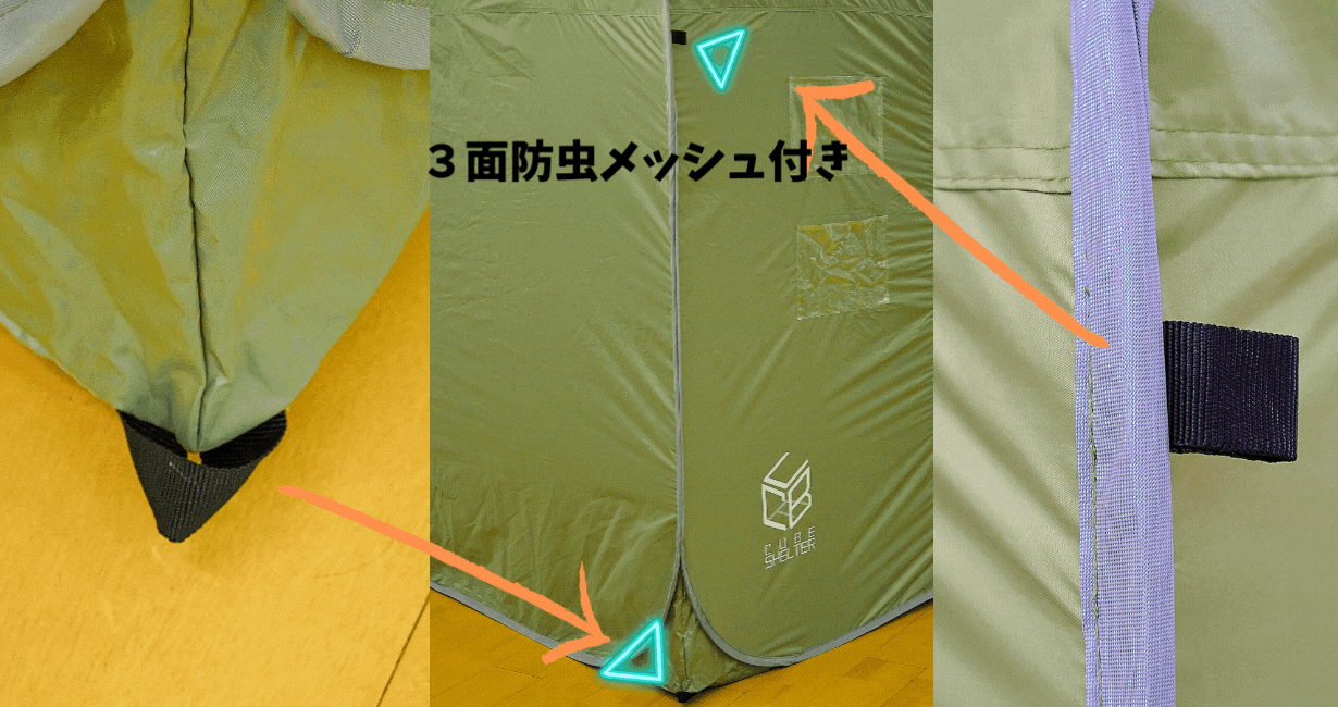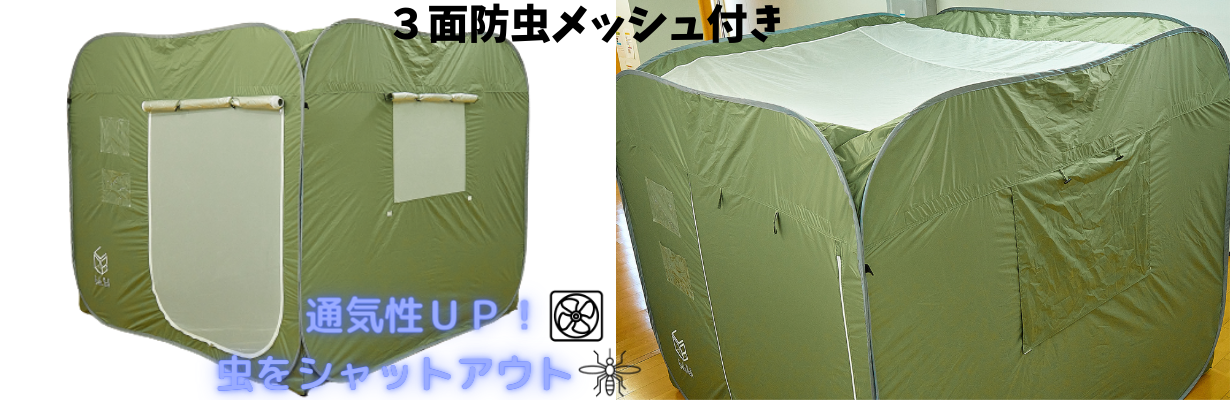 出入口及び横窓は外面から、天井は内面から、テント生地でメッシュを塞ぐことができます。