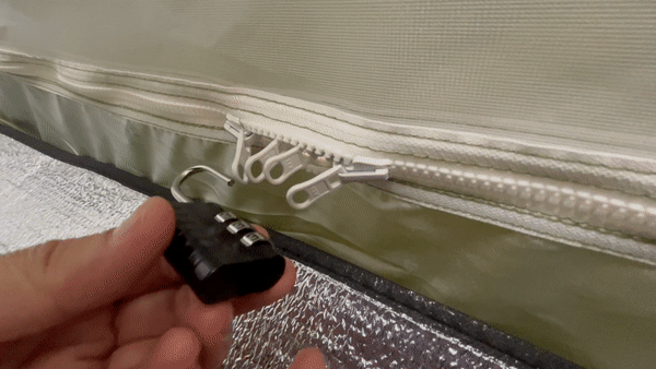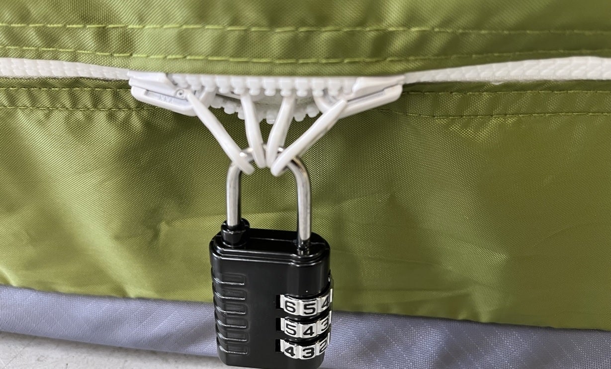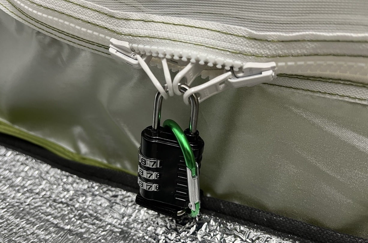 就寝時は出入口ファスナー(テント生地・メッシュ生地)のツマミをそれぞれテント内部へ引き込み、ダイヤル錠でまとめて施錠。外出時は出入口ファスナー(テント生地・メッシュ生地)のツマミをそれぞれ引き出し、ダイヤル錠でまとめて施錠。