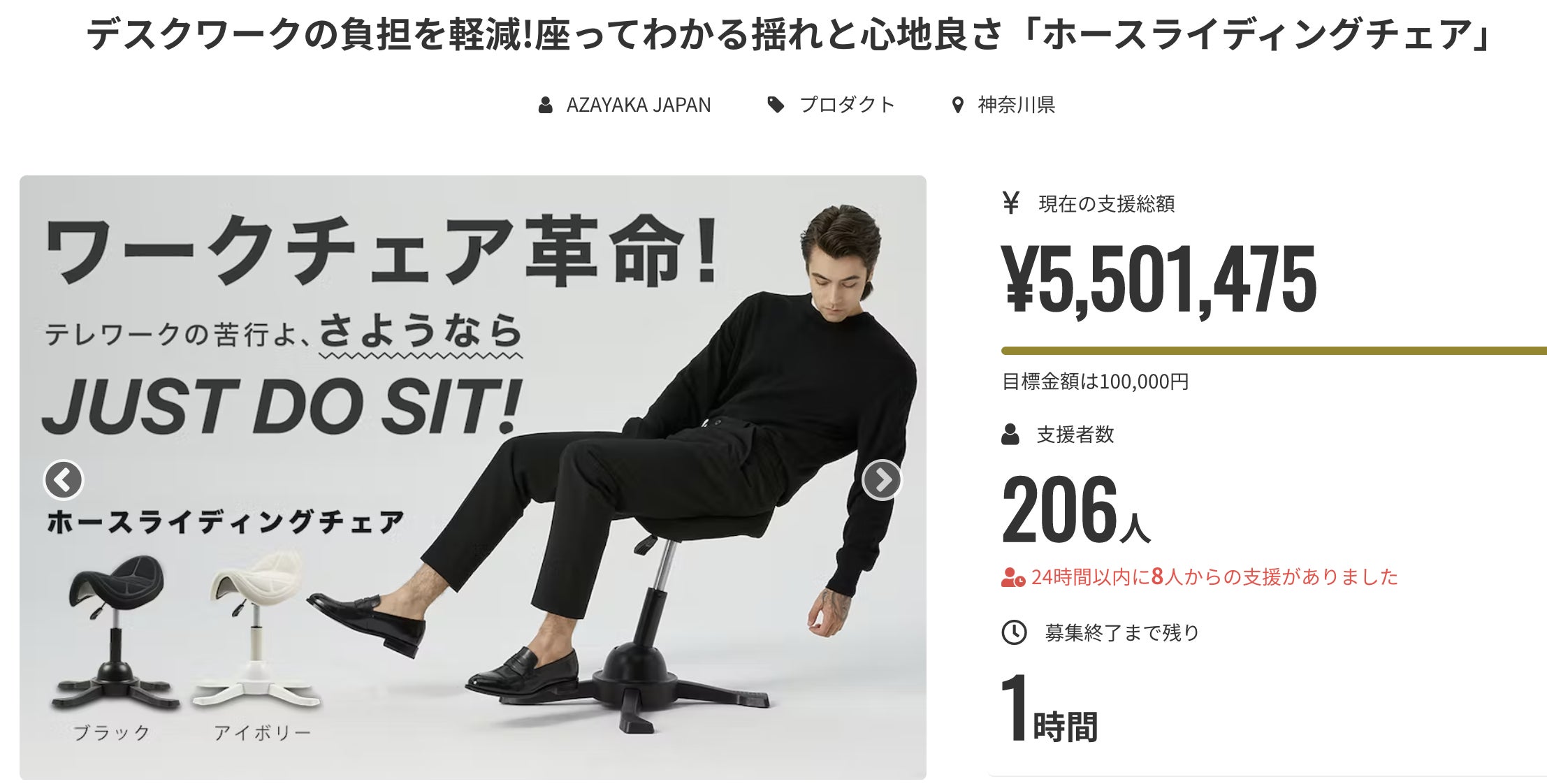 ホースライディングチェアキャンペーンはあと1時間で終了となります。現在【206名】のサポーター様にご支援いただいております。お力添えいただき誠にありがとうございます!ご購入を検討されているお客様、キャンペーンは本日23時59分にて終了となります。ラストチャンスでございます。ご検討よろしくお願い致します。デスクワークの負担を軽減!座ってわかる揺れと心地良さ「ホースライディングチェア」