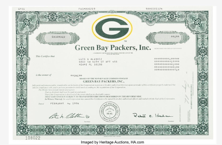 これは本拠地所在地の街グリーンベイの住民数は、10万人と米国では極めて小さな街にもかかわらず、長年強豪チームであり、熱狂的なファンを持つNFLの グリーンベイ パッカーズの象徴、パッカーズの「株券」です。メインスポンサーが契約を打ち切り、チーム経営の崖っぷちにあった際、チームを救うべく「The Hungry Five」と呼ばれるメンバーが「グリーンベイ・フットボール株式会社」を設立。株券を発行し、10万人のグリーンベイ市民に販売し、資金調達をして経営難を乗り越えたとのこと。この株は通常の株とは異なり、個人売買禁止で配当はなし。株主に与えられる特別な権利は、オリジナル商品の購入権利、そして「パッカーズのオーナーの1人であるという名誉」のみです。そしてトレードは禁止ですが、親族で相続することが可能。これが10万人しかいない街のチームが、常に会場には熱狂的なファンを集め続ける理由、「市民オーナー制度」なのです。