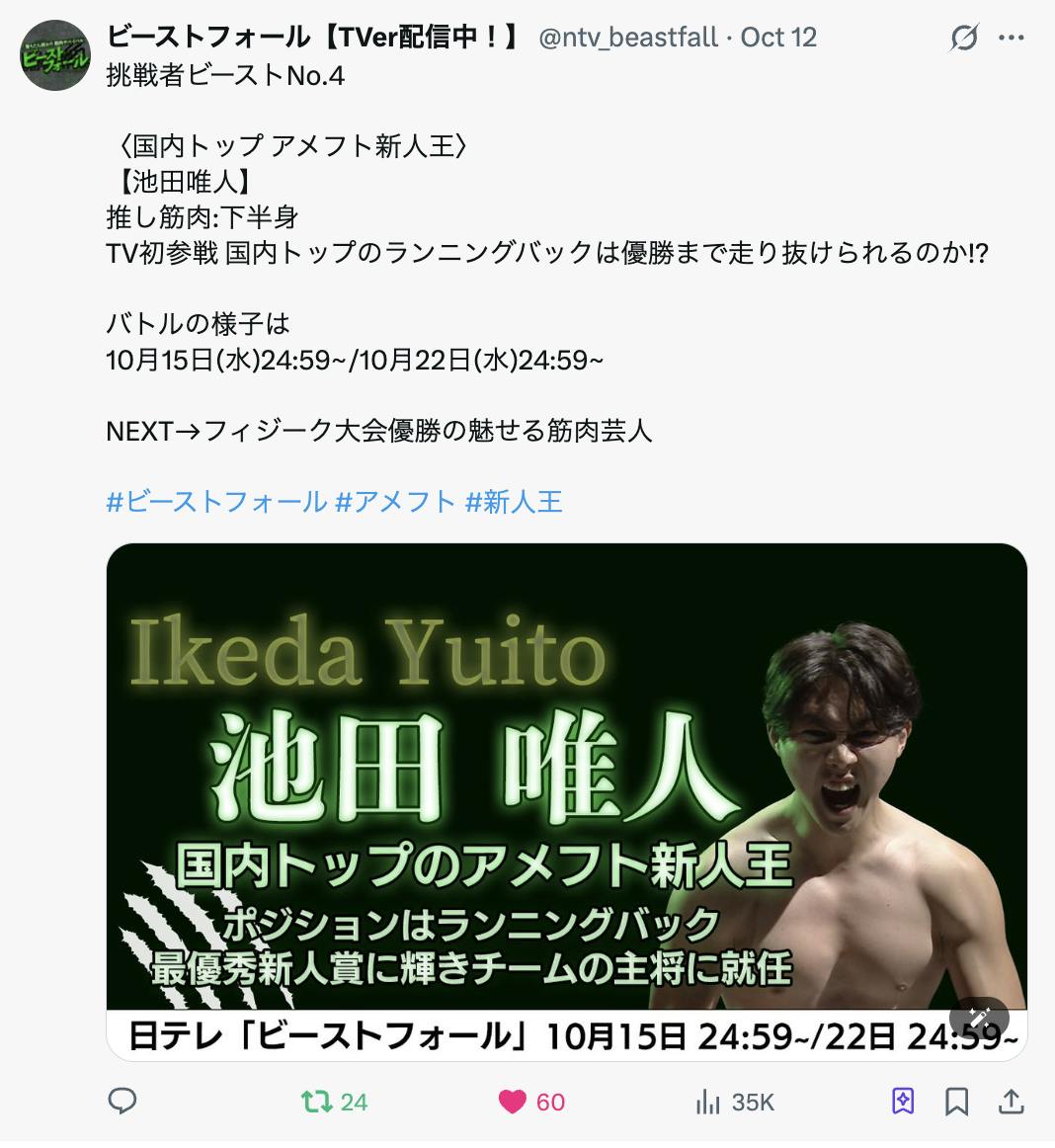 キャプテンの池田選手が 日テレ特番 「ビーストフォール」に出演したこともあり、その放送時期に連動し、10月29日終了に延長しました。