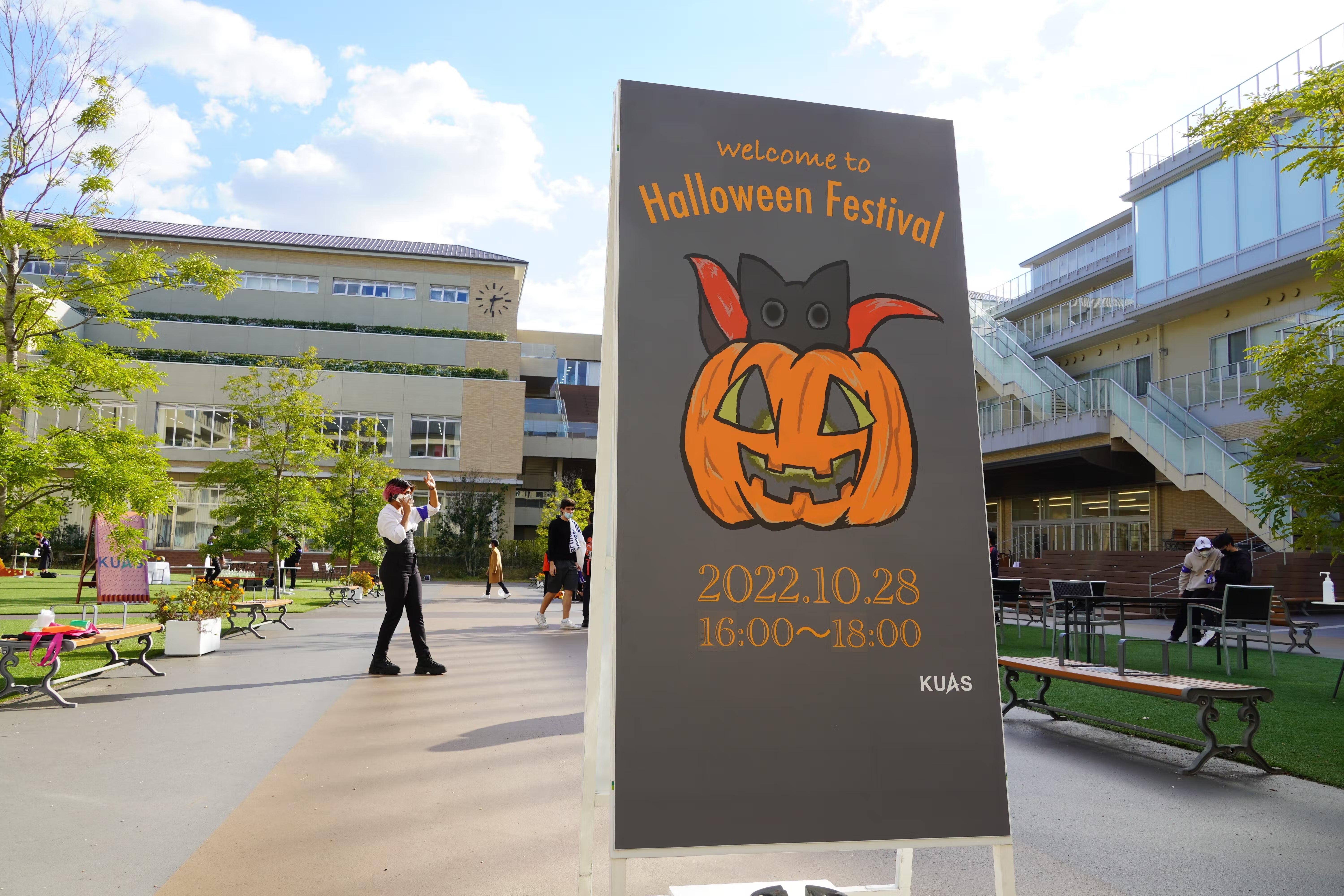 10月28日(木)澄み切った秋空の午後、ハロウィーンイベントを開催。ウクライナ人学生に一日でも早く大学生活に馴染んでもらおうと、他の留学生たちや日本人学生たちと交流する場として開催しました。ハロウィーンイベントの企画、宣伝から小道具の作成に至るまで、留学生12人による企画委員会が準備に当たりました。