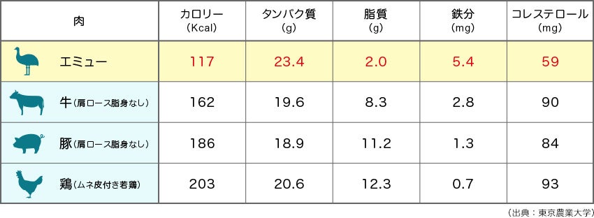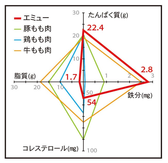 エミュー肉には牛肉の約2.5倍、豚肉の約5倍含まれています。