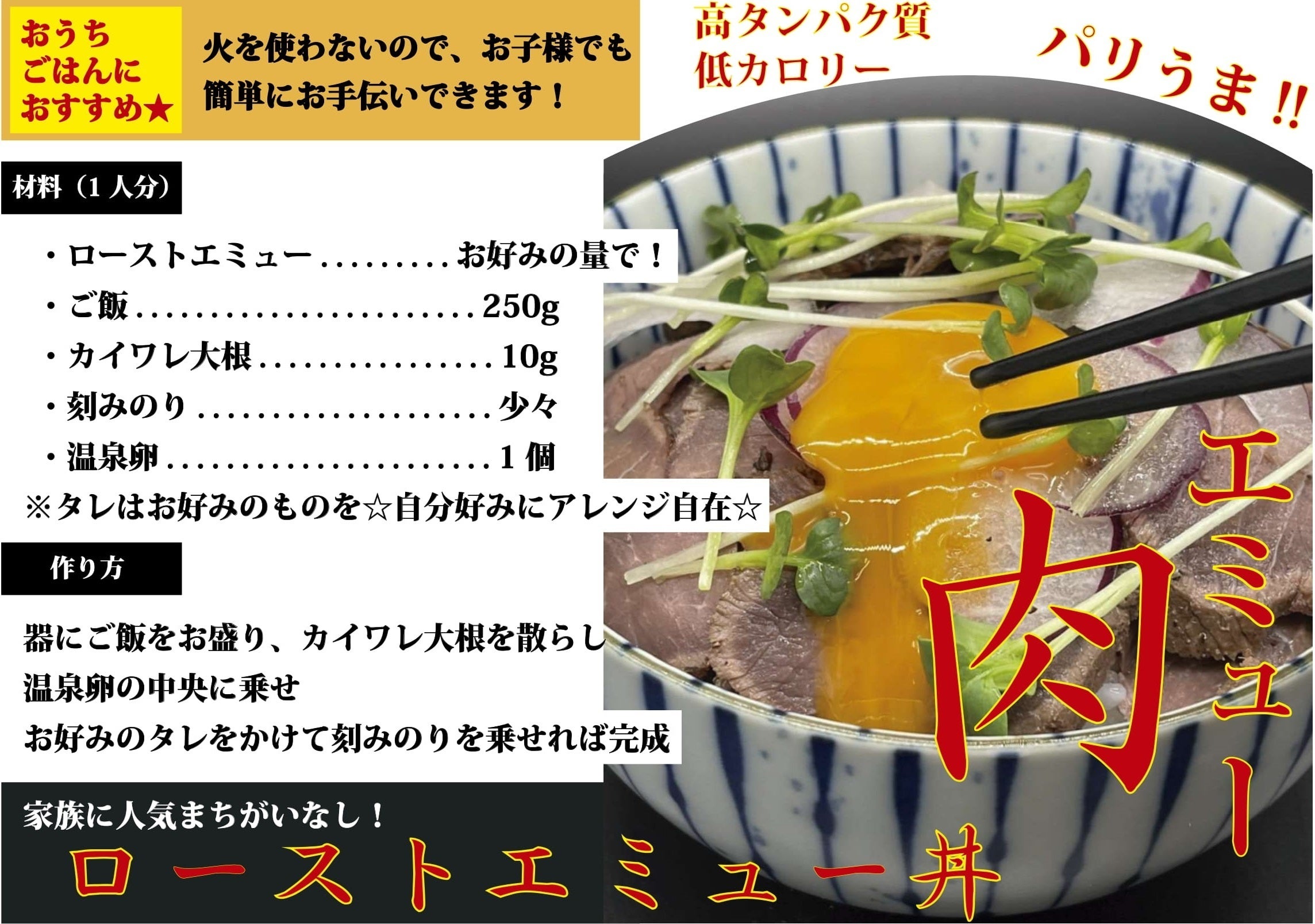 美味しくヘルシーで高タンパク質、低カロリー、、高鉄分のエミュー肉を、より日常的にリーズナブルに食べられるように、