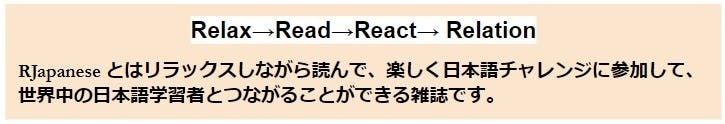 RJapanese とはリラックスして読んで、楽しく日本語を使って、世界中の日本語学習者とつながることができる雑誌です。