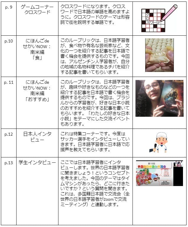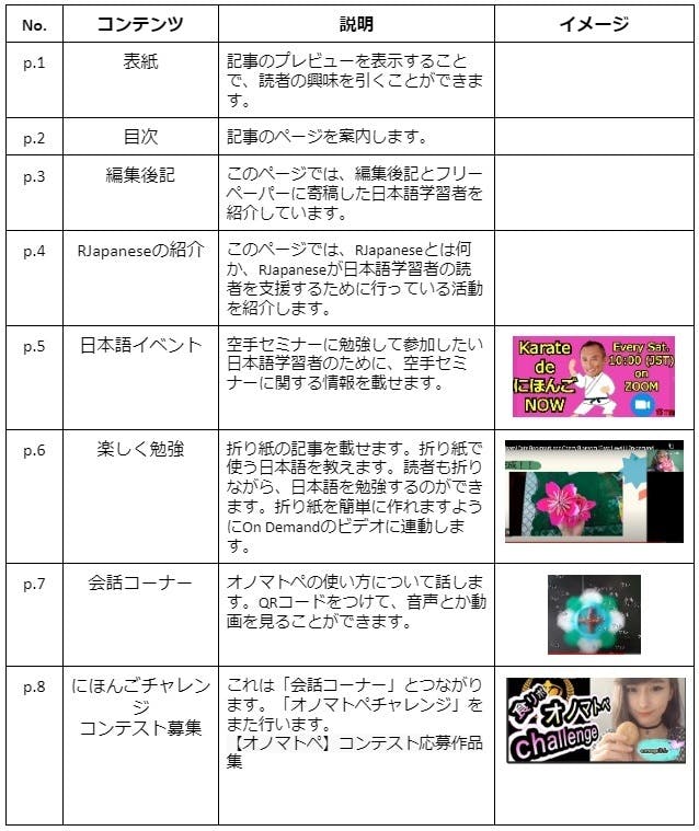 こちらは、世界中の日本語学習者を巻き込んだRJapaneseフリーペーパー第1号のコンテンツプランです。以下は、フリーペーパーのルーブリックの説明です。
