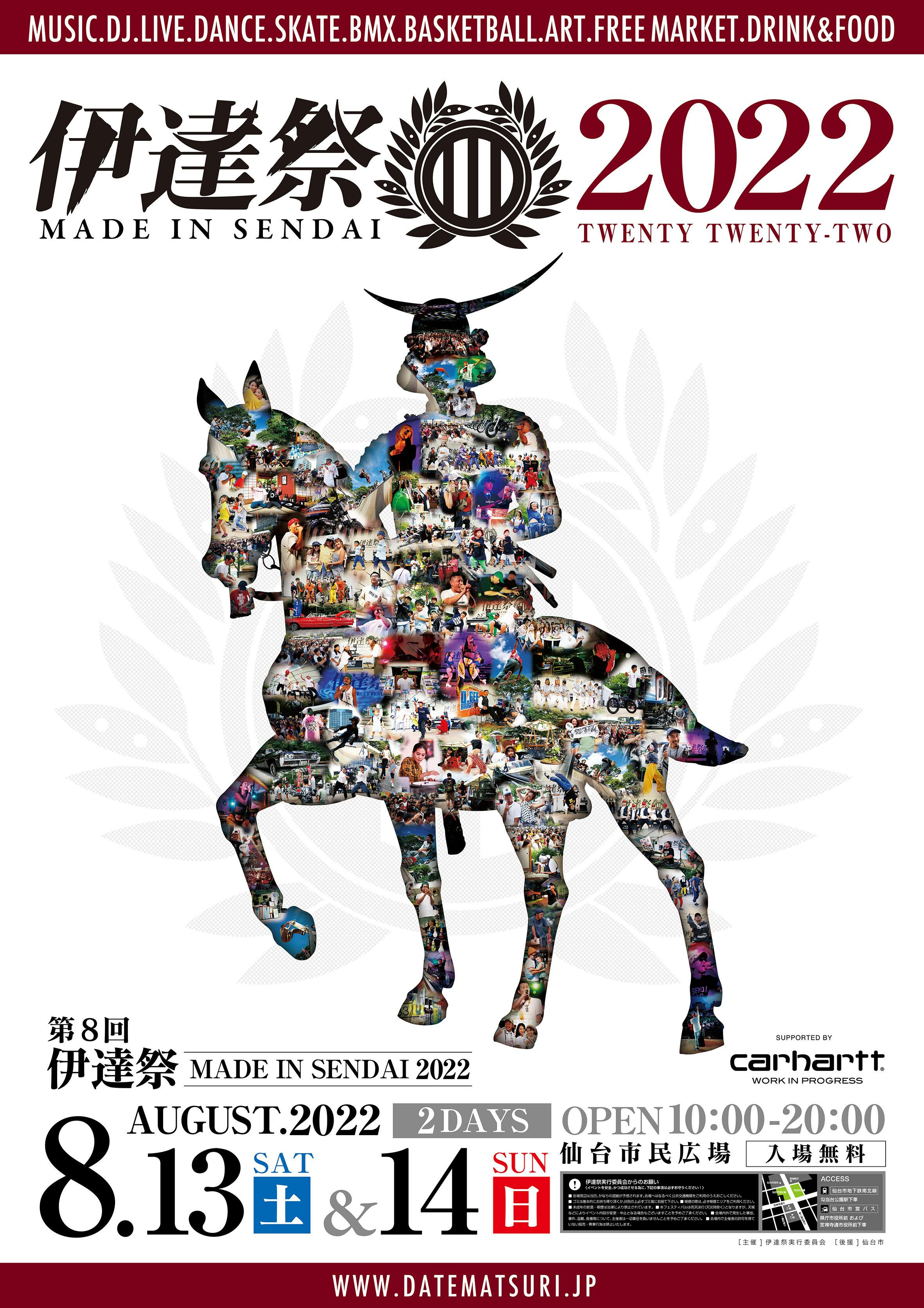 2022年度-第8回-の「伊達祭」は、2018年以来4年ぶりの開催になります。2020、2021年は新型コロナウイルス感染症の蔓延防止と安全確保の観点から中止しました。コロナは祭りだけでなく、観光、飲食、小売業などさまざまな分野に影響を及ぼしています。苦しい状況は今なお続いていますが、「地域を元気にしたい」「子どもたちに夢を与えたい」という思いから今夏の祭り開催を決定しました。仙台市民広場にて行われ、 「MADE IN SENDAI LOCAL -仙台発展・発信-」をコンセプトとし、イベントを開催しております。私たちは、地元はもちろん伊達祭や仙台のストリートカルチャーを応援してくれる全国の皆さまと共に前を向き、100年続く祭をめざしてリスタートします。