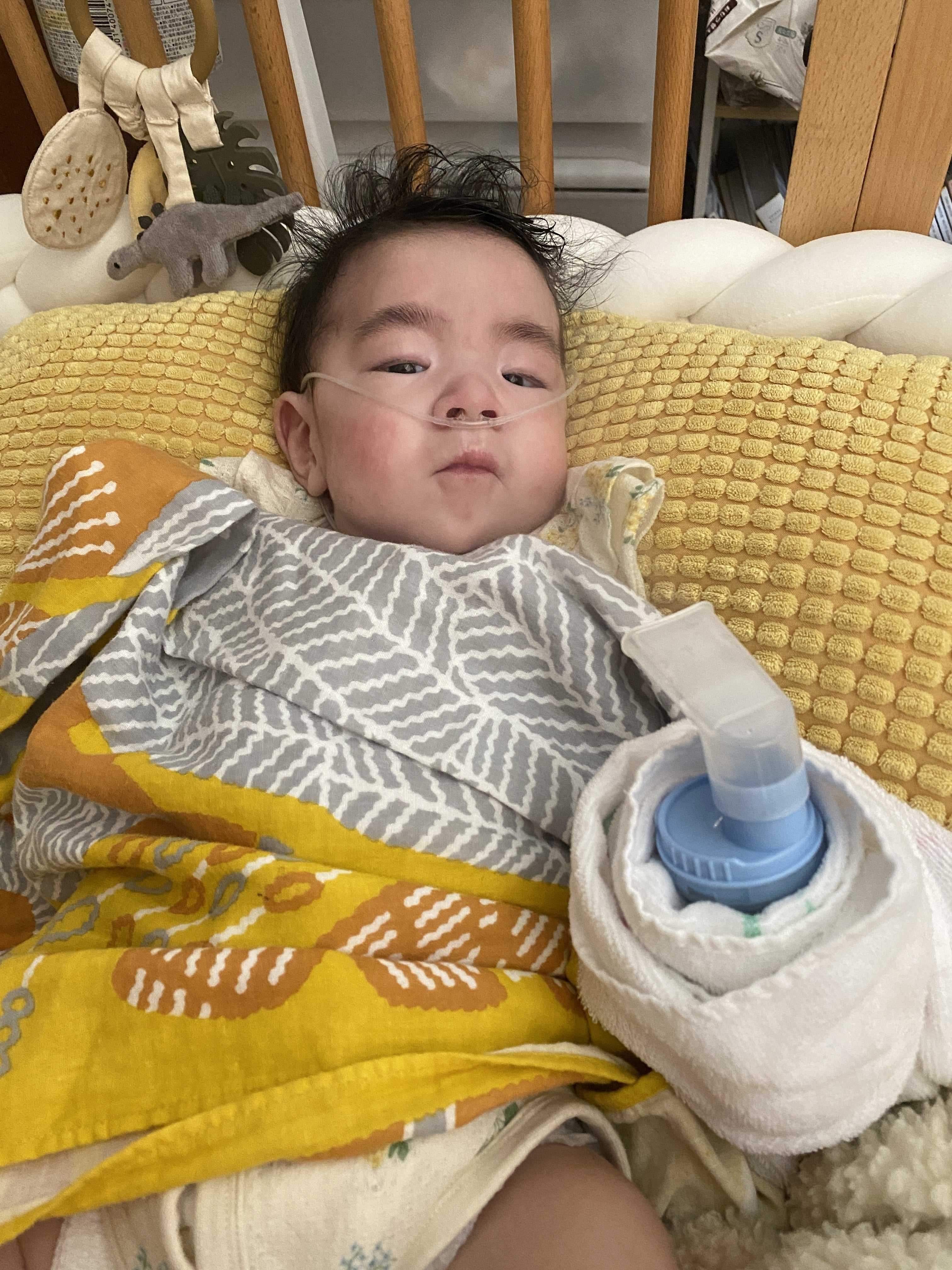 気管切開をする前。常に酸素と吸入、吸引が必要。未熟児網膜症と難聴、脳室周囲白質軟化症、てんかんがあります。なんとしてもこの子を守りたいので、過不足なくケアをしてあげたいのです。
