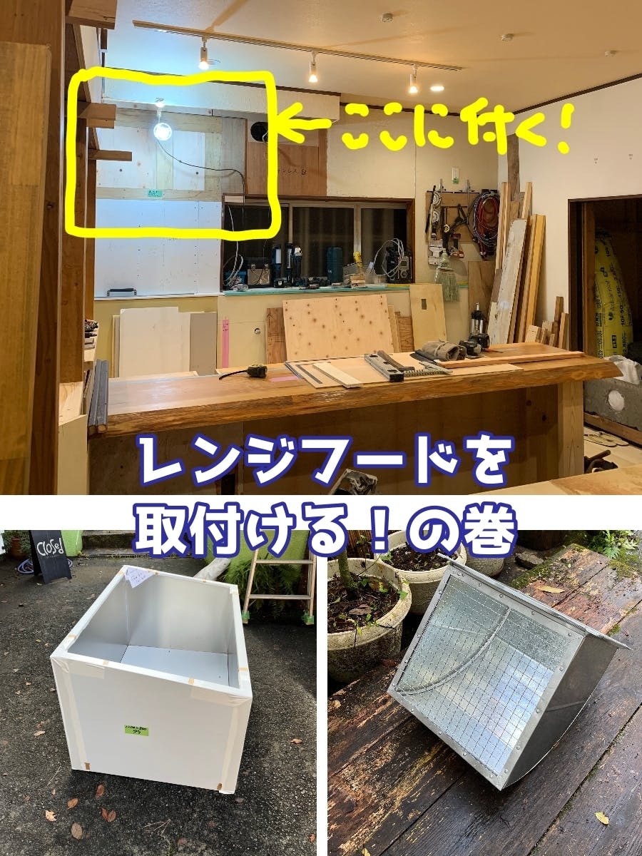 今回はキッチン什器の第一弾とも言えるガスオーブンの上に取り付ける[レンジフード』の取り付けです。