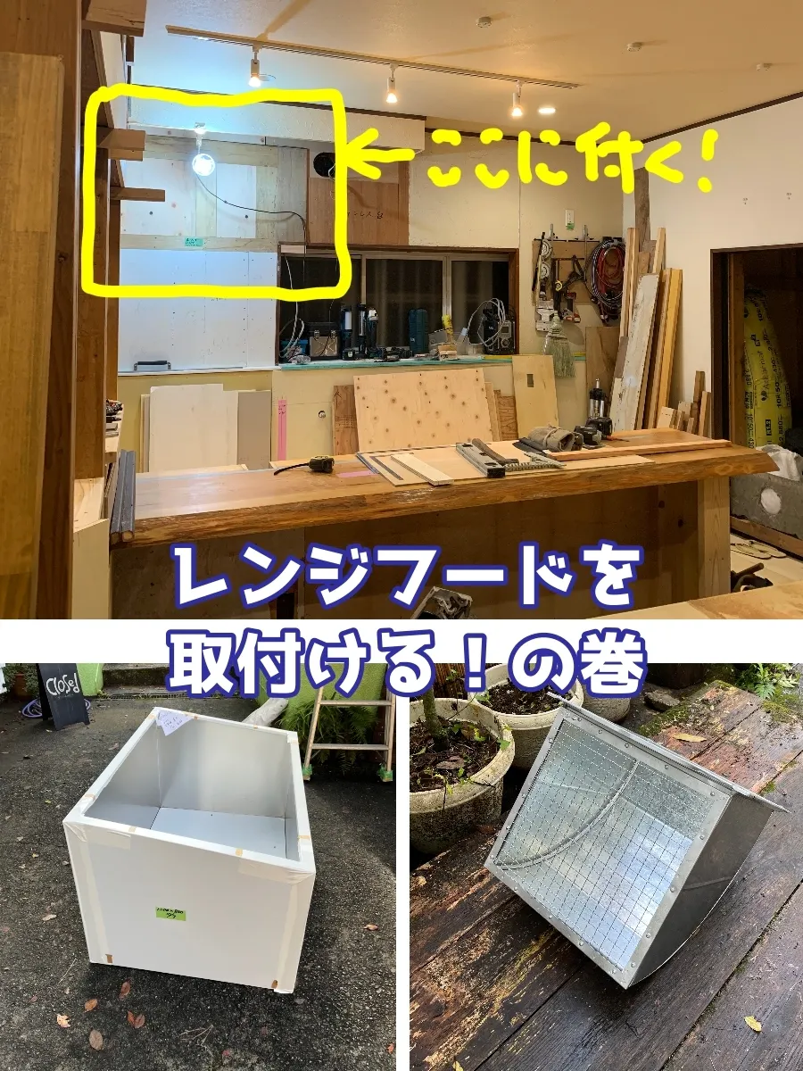 キッチン作りには色々な手順があるのですが、天井に付けていくキッチンフードは他の物が入る前に入れないと、足場が作れずとても大変なので、いの一番に取り付けるのがスムーズです。