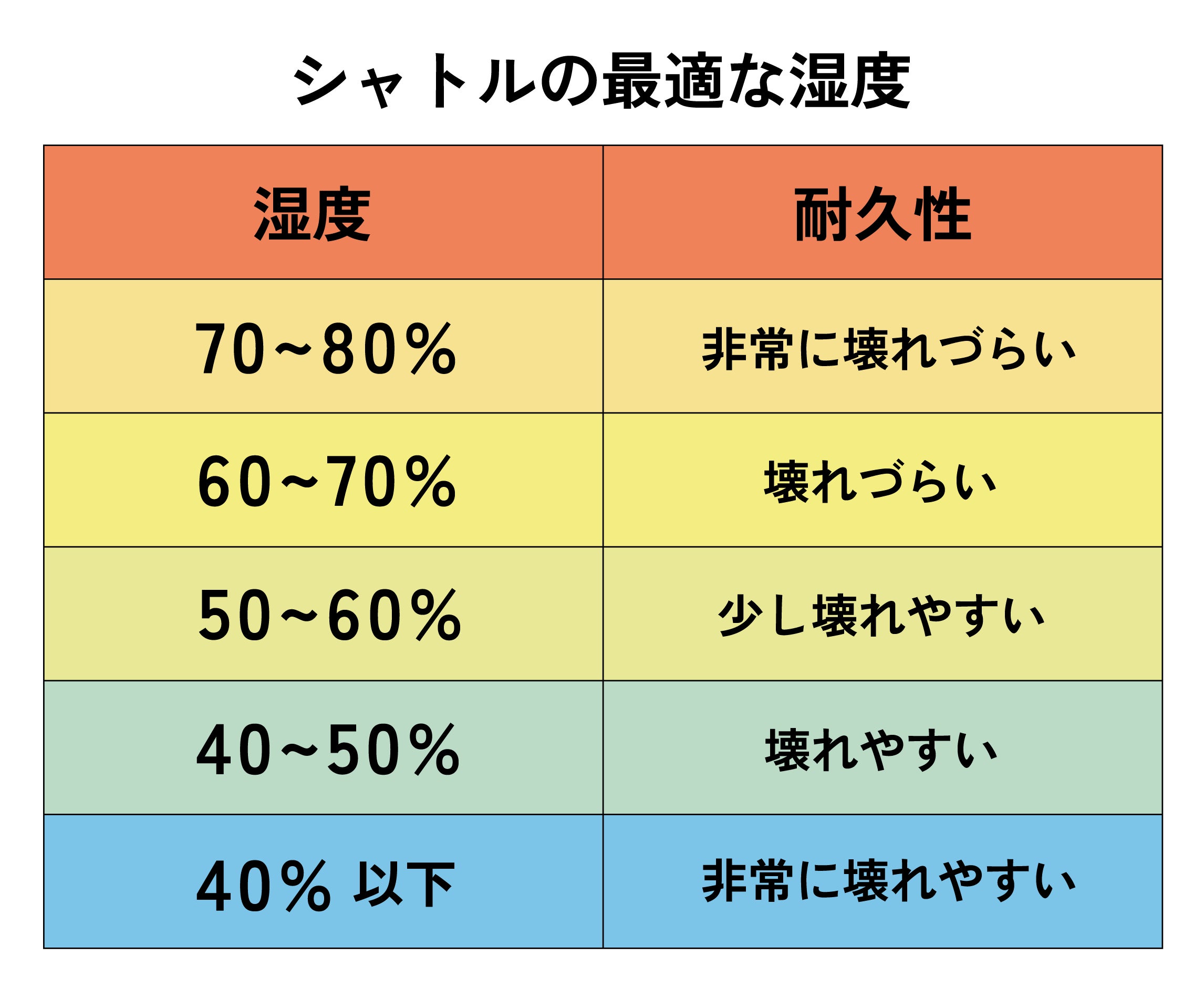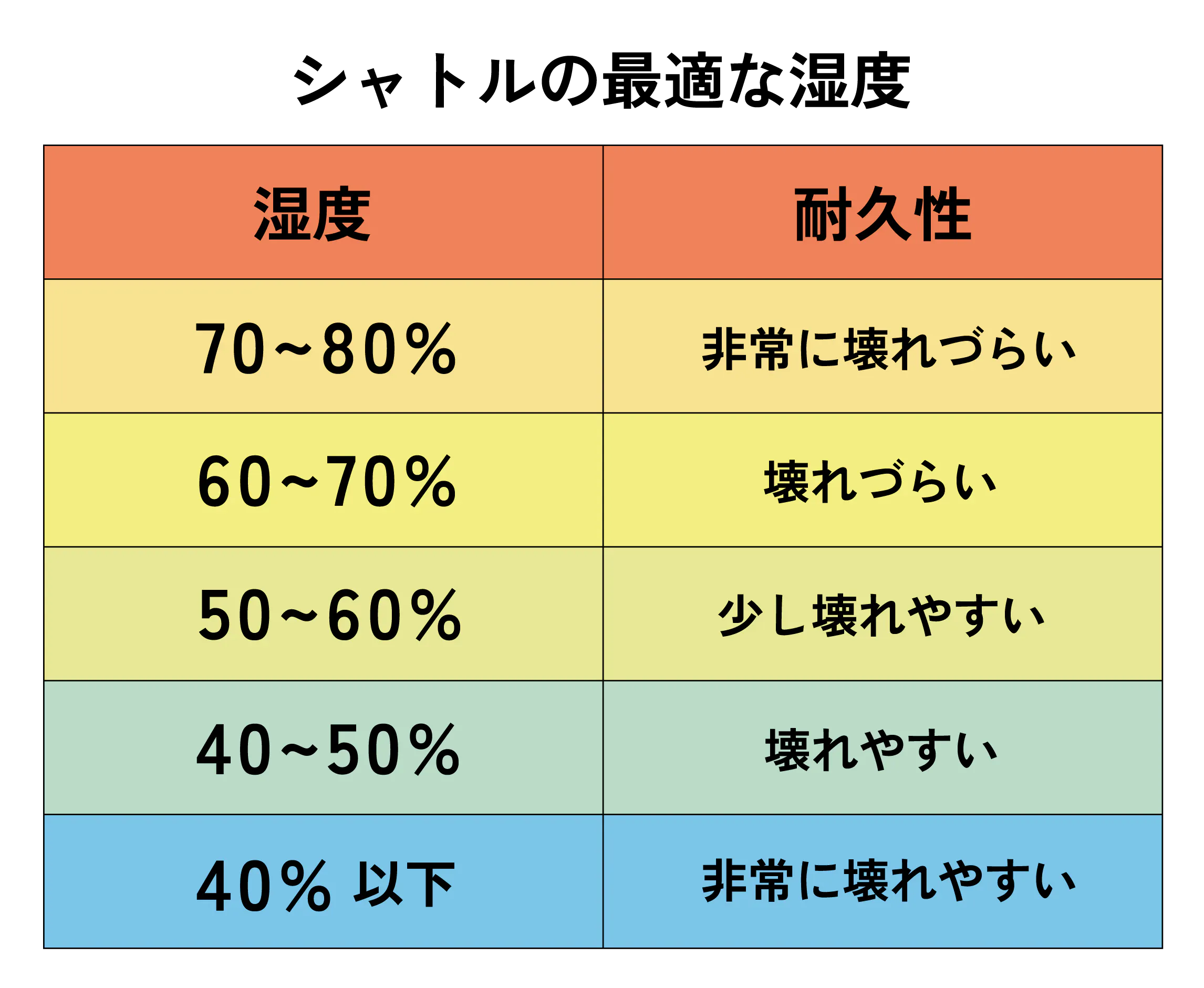 上のグラフを見る限り、全体的に湿度が60%以上あるのでシャトルは「壊れづらい」と思われるかもしれませんが、これは月の平均値を取ったものであり、1日1日で見ると湿度は大きく変動します。