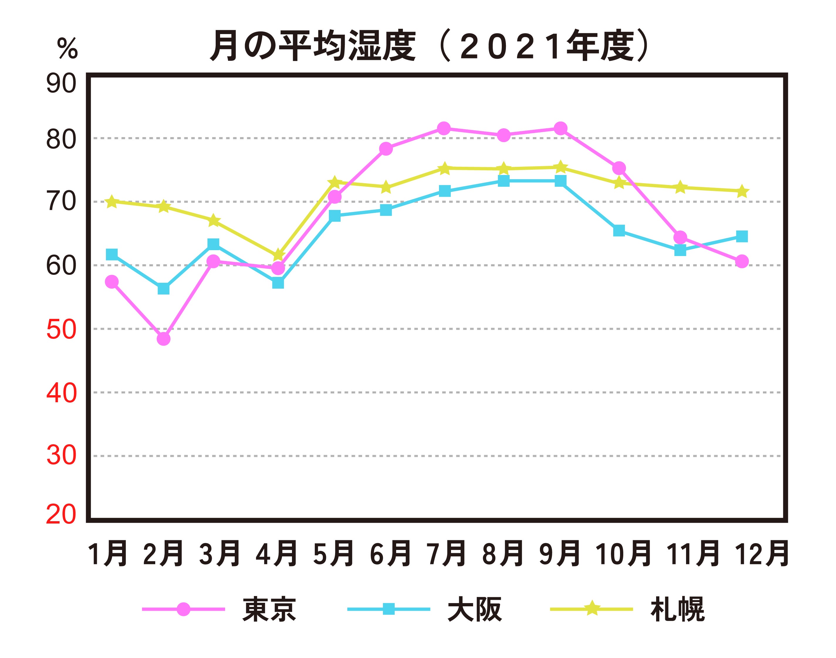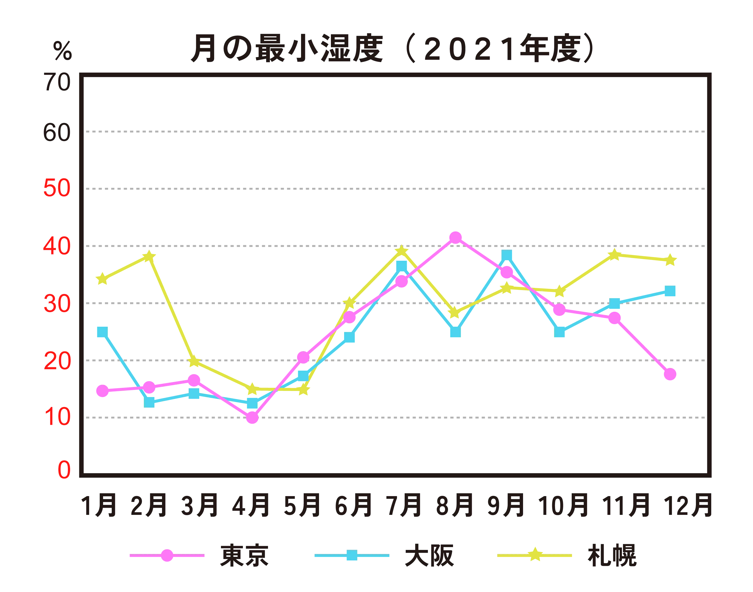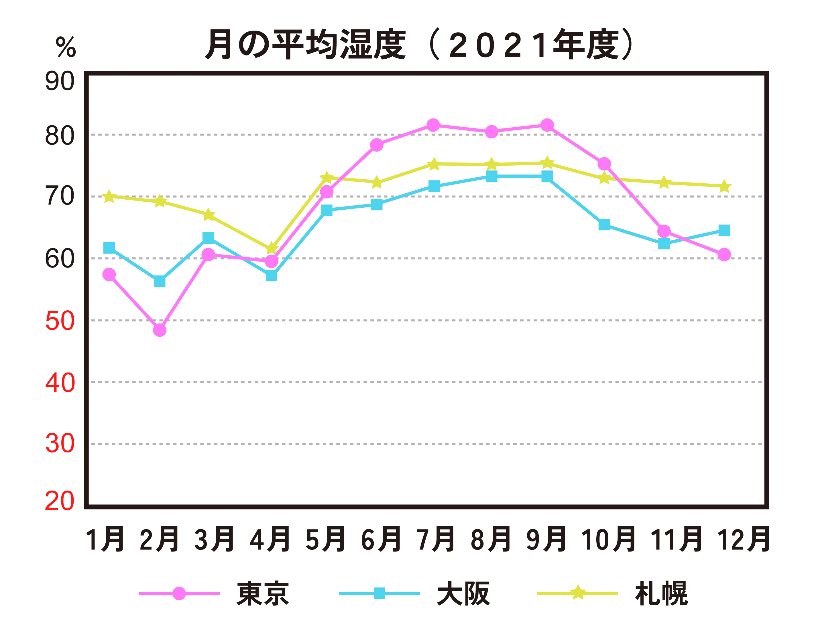 日本は世界的にも寒暖差の激しい特殊な気候の国です。夏は湿度が90%以上、冬は30%以下など振れ幅の大きい環境にあります。