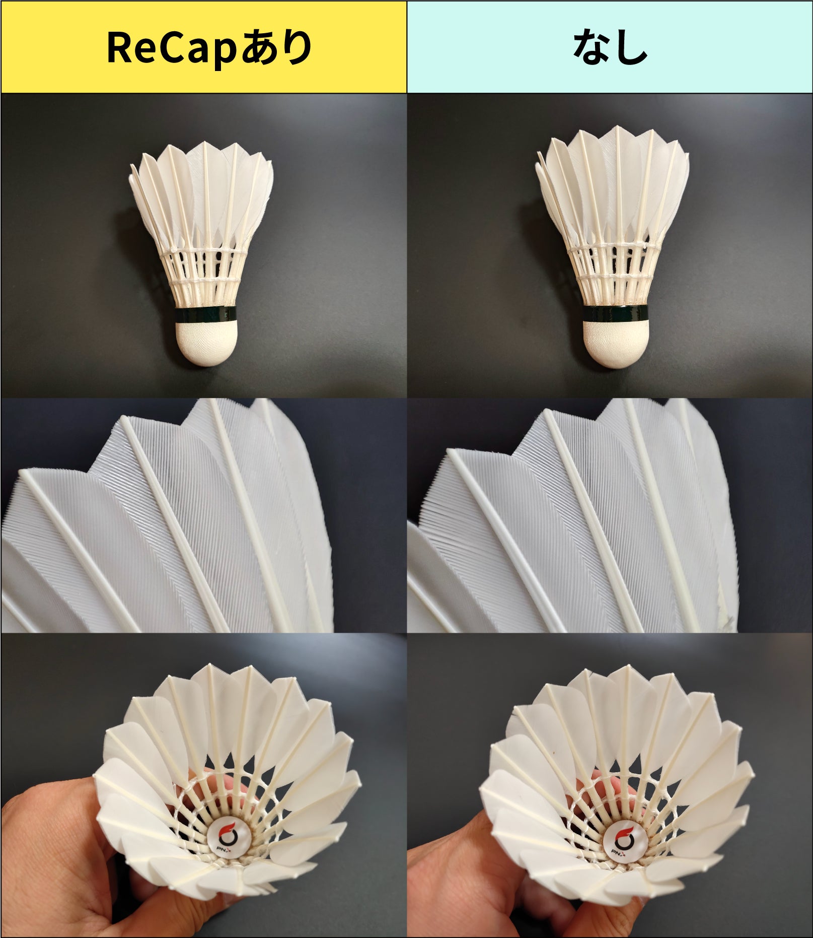予めご理解いただきたいのが、ReCapを装着したシャトル全てが全く壊れなくなるということではありません。壊れる速度が緩やかになり、ポキっと1枚折れが大幅に軽減され、壊れ方が綺麗になるイメージです。