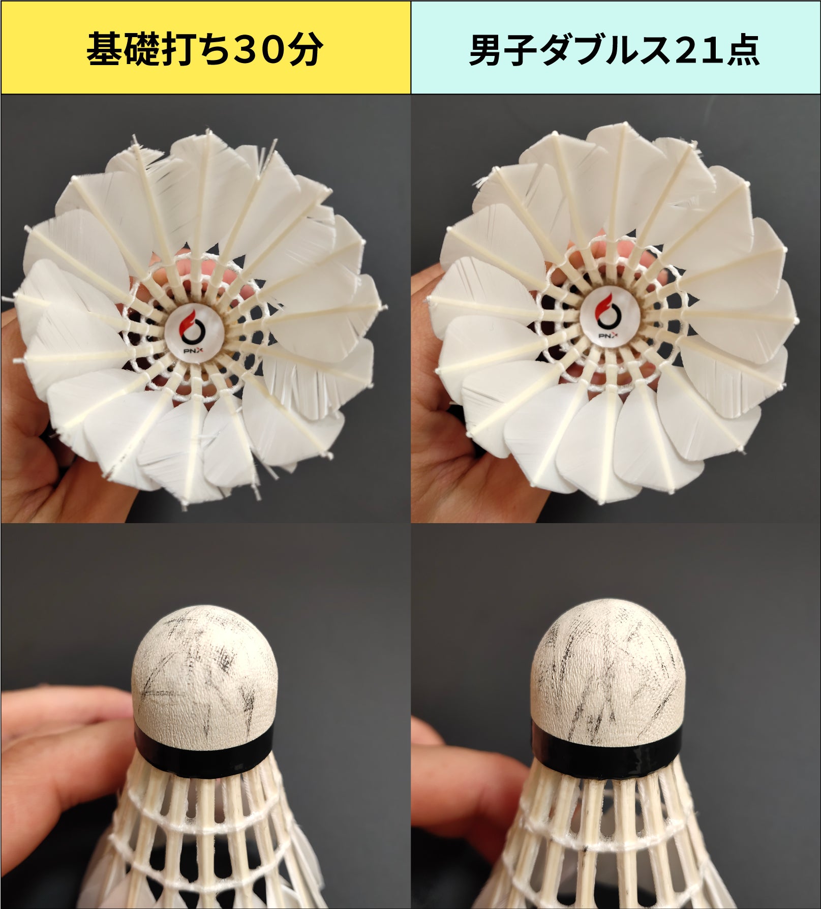 ReCapで加湿済みのシャトルは以下のような消耗具合となり、ポキっと1枚だけ折れるリスクが大幅に軽減され、夏場のような粘り強い耐久性能を発揮してくれます。