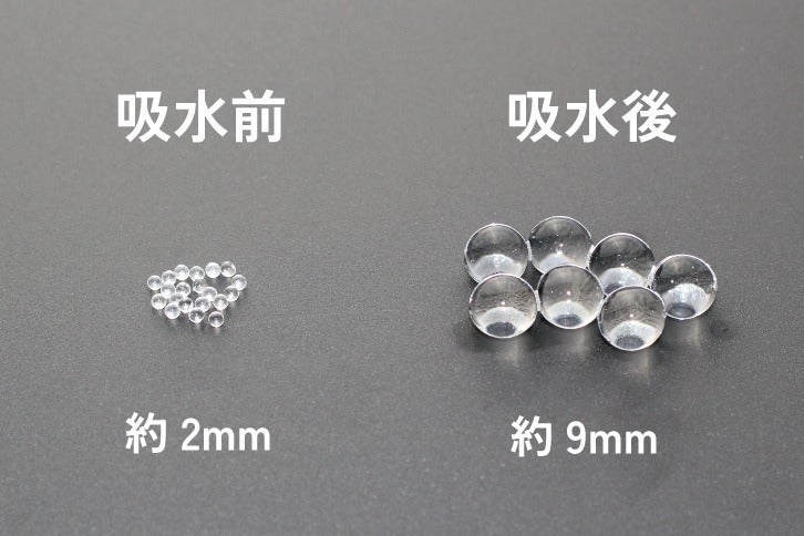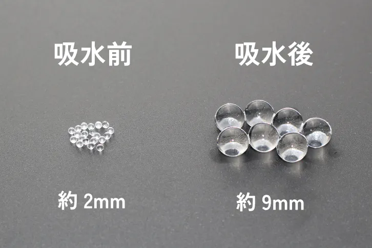 約2mmほどのビーズ玉に水を吸わせます。1時間ほど浸水しておくと約9mmまでビーズ玉が大きくなります。